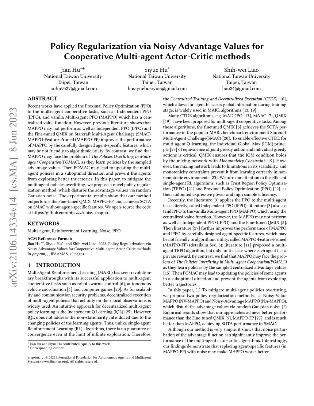 Multi-Agent Reinforcement Learning (MARL) has seen revolutionary breakthroughs with its successful application to multi-agent cooperative tasks such as robot swarms control, autonomous vehicle coordination, and computer games. In this paper, we propose Noisy-MAPPO, which achieves more than 90% winning rates in all StarCraft Multi-agent Challenge (SMAC) scenarios. First, we theoretically generalize Proximal Policy Optimization (PPO) to Multi-agent PPO (MAPPO) by lower bound of Trust Region Policy Optimization (TRPO). However, we find the shared advantage values in such MAPPO objective function may mislead the learning of some agents, which are not related to these advantage values, called The Policies Overfitting in Multi-agent Cooperation(POMAC). Therefore, we propose noise advatange-value methods (Noisy-MAPPO and Advantage-Noisy-MAPPO) to solve this problem. The experimental results show that our random noise method improves the performance of vanilla MAPPO by 80% in some Super-Hard scenarios in SMAC. We open-source the code at \url{https://github.com/hijkzzz/noisy-mappo}.
