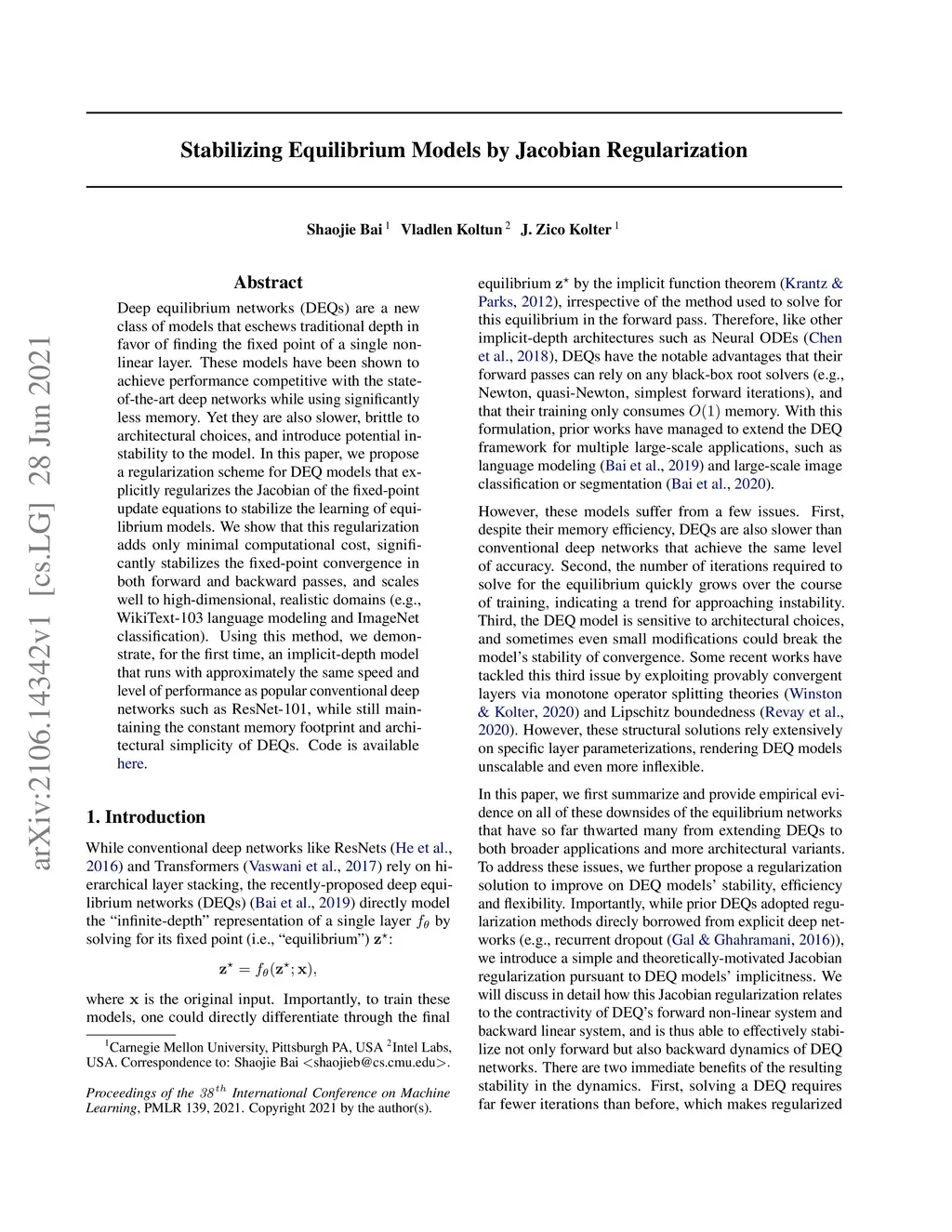 Stabilizing Equilibrium Models by Jacobian Regularization