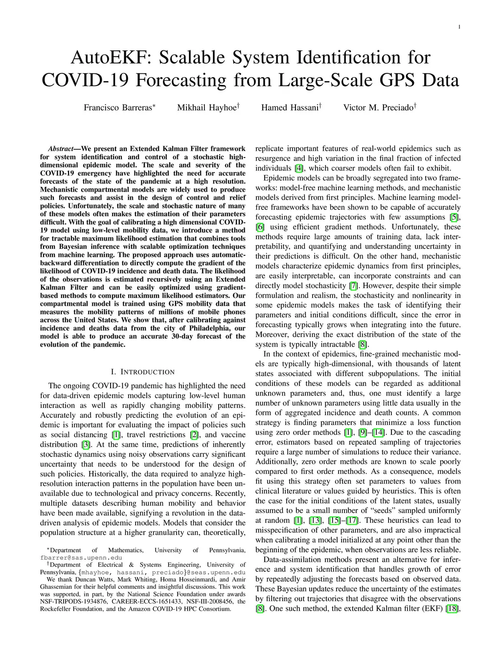 We present an Extended Kalman Filter framework for system identification and control of a stochastic high-dimensional epidemic model. The scale and severity of the COVID-19 emergency have highlighted the need for accurate forecasts of the state of the pandemic at a high resolution. Mechanistic compartmental models are widely used to produce such forecasts and assist in the design of control and relief policies. Unfortunately, the scale and stochastic nature of many of these models often makes the estimation of their parameters difficult. With the goal of calibrating a high dimensional COVID-19 model using low-level mobility data, we introduce a method for tractable maximum likelihood estimation that combines tools from Bayesian inference with scalable optimization techniques from machine learning. The proposed approach uses automatic backward-differentiation to directly compute the gradient of the likelihood of COVID-19 incidence and death data. The likelihood of the observations is estimated recursively using an Extended Kalman Filter and can be easily optimized using gradient-based methods to compute maximum likelihood estimators. Our compartmental model is trained using GPS mobility data that measures the mobility patterns of millions of mobile phones across the United States. We show that, after calibrating against incidence and deaths data from the city of Philadelphia, our model is able to produce an accurate 30-day forecast of the evolution of the pandemic.