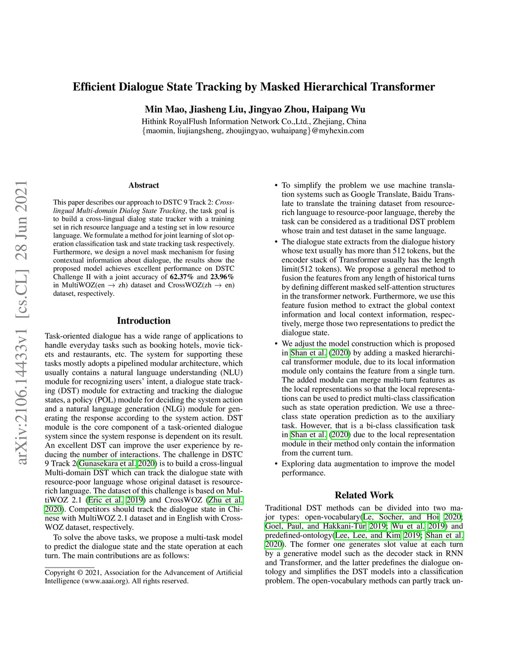 Efficient Dialogue State Tracking by Masked Hierarchical Transformer