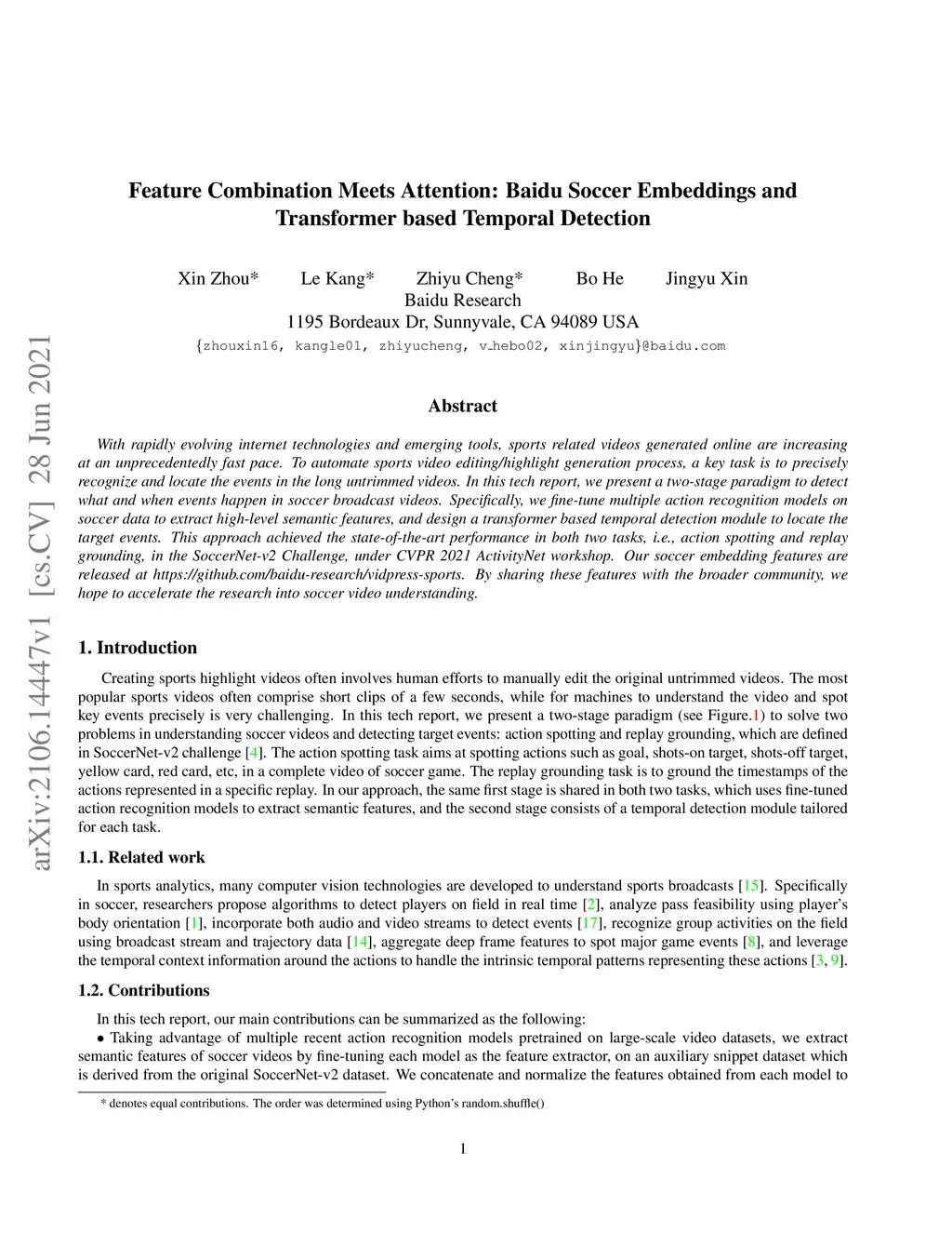 With rapidly evolving internet technologies and emerging tools, sports related videos generated online are increasing at an unprecedentedly fast pace. To automate sports video editing/highlight generation process, a key task is to precisely recognize and locate the events in the long untrimmed videos. In this tech report, we present a two-stage paradigm to detect what and when events happen in soccer broadcast videos. Specifically, we fine-tune multiple action recognition models on soccer data to extract high-level semantic features, and design a transformer based temporal detection module to locate the target events. This approach achieved the state-of-the-art performance in both two tasks, i.e., action spotting and replay grounding, in the SoccerNet-v2 Challenge, under CVPR 2021 ActivityNet workshop. Our soccer embedding features are released at https://github.com/baidu-research/vidpress-sports. By sharing these features with the broader community, we hope to accelerate the research into soccer video understanding.