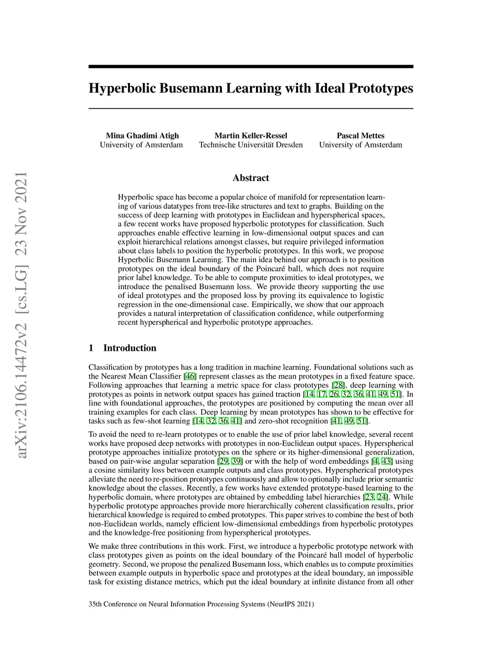 Hyperbolic space has become a popular choice of manifold for representation learning of various datatypes from tree-like structures and text to graphs. Building on the success of deep learning with prototypes in Euclidean and hyperspherical spaces, a few recent works have proposed hyperbolic prototypes for classification. Such approaches enable effective learning in low-dimensional output spaces and can exploit hierarchical relations amongst classes, but require privileged information about class labels to position the hyperbolic prototypes. In this work, we propose Hyperbolic Busemann Learning. The main idea behind our approach is to position prototypes on the ideal boundary of the Poincar\é ball, which does not require prior label knowledge. To be able to compute proximities to ideal prototypes, we introduce the penalised Busemann loss. We provide theory supporting the use of ideal prototypes and the proposed loss by proving its equivalence to logistic regression in the one-dimensional case. Empirically, we show that our approach provides a natural interpretation of classification confidence, while outperforming recent hyperspherical and hyperbolic prototype approaches.