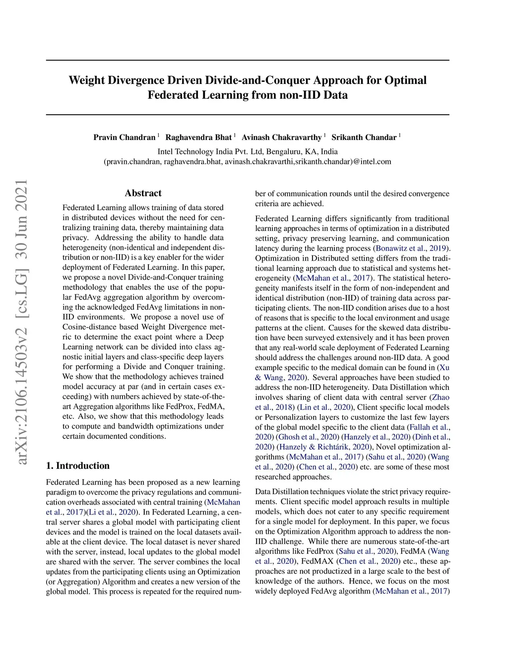Federated Learning allows training of data stored in distributed devices without the need for centralizing training data, thereby maintaining data privacy. Addressing the ability to handle data heterogeneity (non-identical and independent distribution or non-IID) is a key enabler for the wider deployment of Federated Learning. In this paper, we propose a novel Divide-and-Conquer training methodology that enables the use of the popular FedAvg aggregation algorithm by overcoming the acknowledged FedAvg limitations in non-IID environments. We propose a novel use of Cosine-distance based Weight Divergence metric to determine the exact point where a Deep Learning network can be divided into class agnostic initial layers and class-specific deep layers for performing a Divide and Conquer training. We show that the methodology achieves trained model accuracy at par (and in certain cases exceeding) with numbers achieved by state-of-the-art Aggregation algorithms like FedProx, FedMA, etc. Also, we show that this methodology leads to compute and bandwidth optimizations under certain documented conditions.