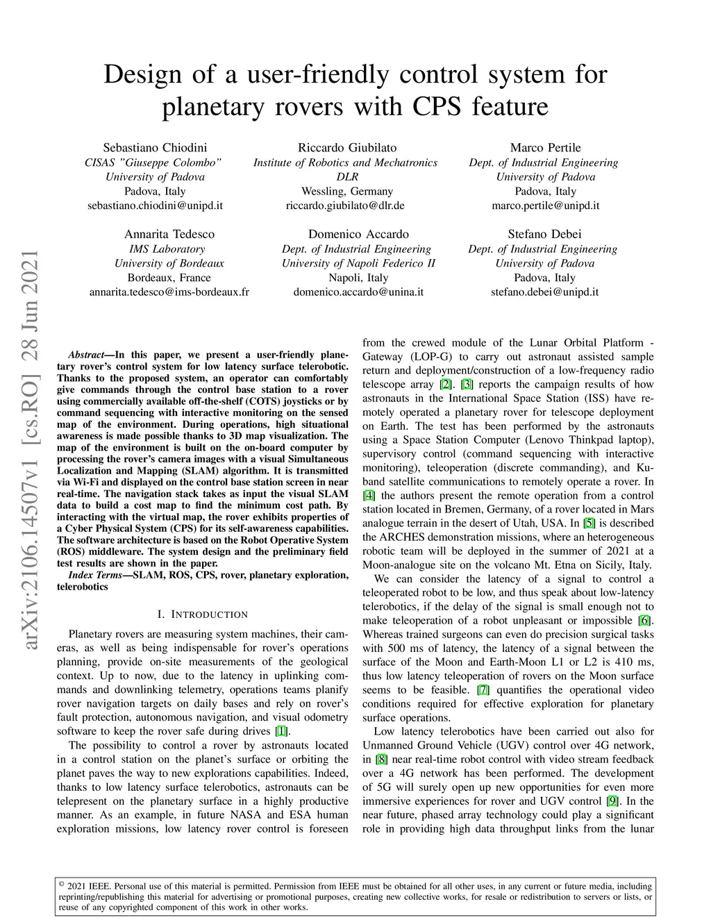 In this paper, we present a user-friendly planetary rover's control system for low latency surface telerobotic. Thanks to the proposed system, an operator can comfortably give commands through the control base station to a rover using commercially available off-the-shelf (COTS) joysticks or by command sequencing with interactive monitoring on the sensed map of the environment. During operations, high situational awareness is made possible thanks to 3D map visualization. The map of the environment is built on the on-board computer by processing the rover's camera images with a visual Simultaneous Localization and Mapping (SLAM) algorithm. It is transmitted via Wi-Fi and displayed on the control base station screen in near real-time. The navigation stack takes as input the visual SLAM data to build a cost map to find the minimum cost path. By interacting with the virtual map, the rover exhibits properties of a Cyber Physical System (CPS) for its self-awareness capabilities. The software architecture is based on the Robot Operative System (ROS) middleware. The system design and the preliminary field test results are shown in the paper.