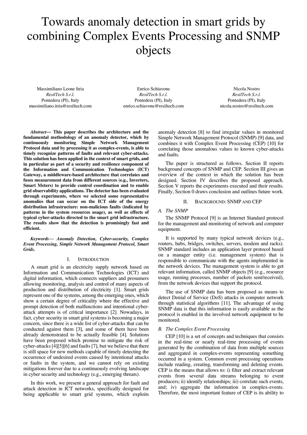 This paper describes the architecture and the fundamental methodology of an anomaly detector, which by continuously monitoring Simple Network Management Protocol data and by processing it as complex-events, is able to timely recognize patterns of faults and relevant cyber-attacks. This solution has been applied in the context of smart grids, and in particular as part of a security and resilience component of the Information and Communication Technologies (ICT) Gateway, a middleware-based architecture that correlates and fuses measurement data from different sources (e.g., Inverters, Smart Meters) to provide control coordination and to enable grid observability applications. The detector has been evaluated through experiments, where we selected some representative anomalies that can occur on the ICT side of the energy distribution infrastructure: non-malicious faults (indicated by patterns in the system resources usage), as well as effects of typical cyber-attacks directed to the smart grid infrastructure. The results show that the detection is promisingly fast and efficient.