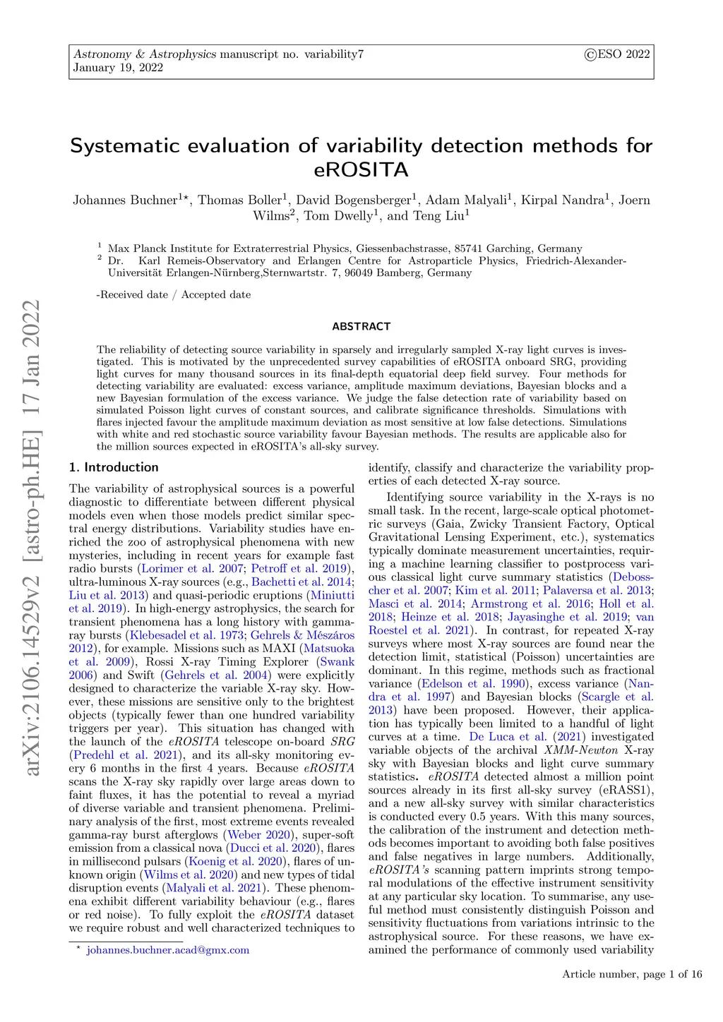 The reliability of detecting source variability in sparsely and irregularly sampled X-ray light curves is investigated. This is motivated by the unprecedented survey capabilities of eROSITA onboard SRG, providing light curves for many thousand sources in its final-depth equatorial deep field survey. Four methods for detecting variability are evaluated: excess variance, amplitude maximum deviations, Bayesian blocks and a new Bayesian formulation of the excess variance. We judge the false detection rate of variability based on simulated Poisson light curves of constant sources, and calibrate significance thresholds. Simulations with flares injected favour the amplitude maximum deviation as most sensitive at low false detections. Simulations with white and red stochastic source variability favour Bayesian methods. The results are applicable also for the million sources expected in eROSITA's all-sky survey.