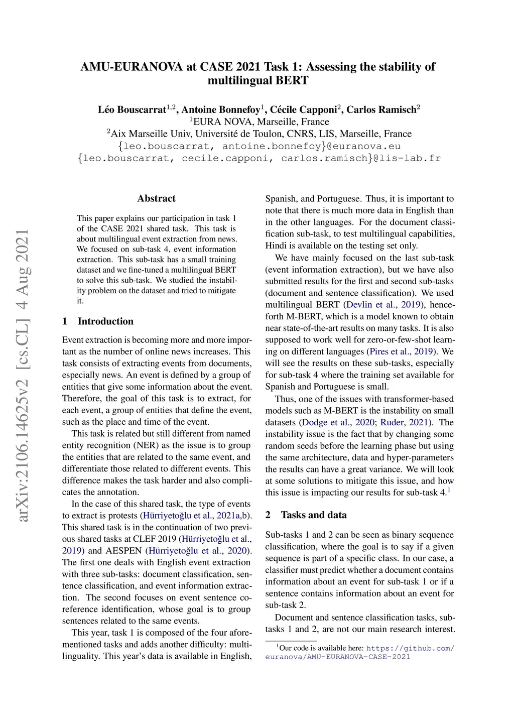 AMU-EURANOVA at CASE 2021 Task 1: Assessing the stability of