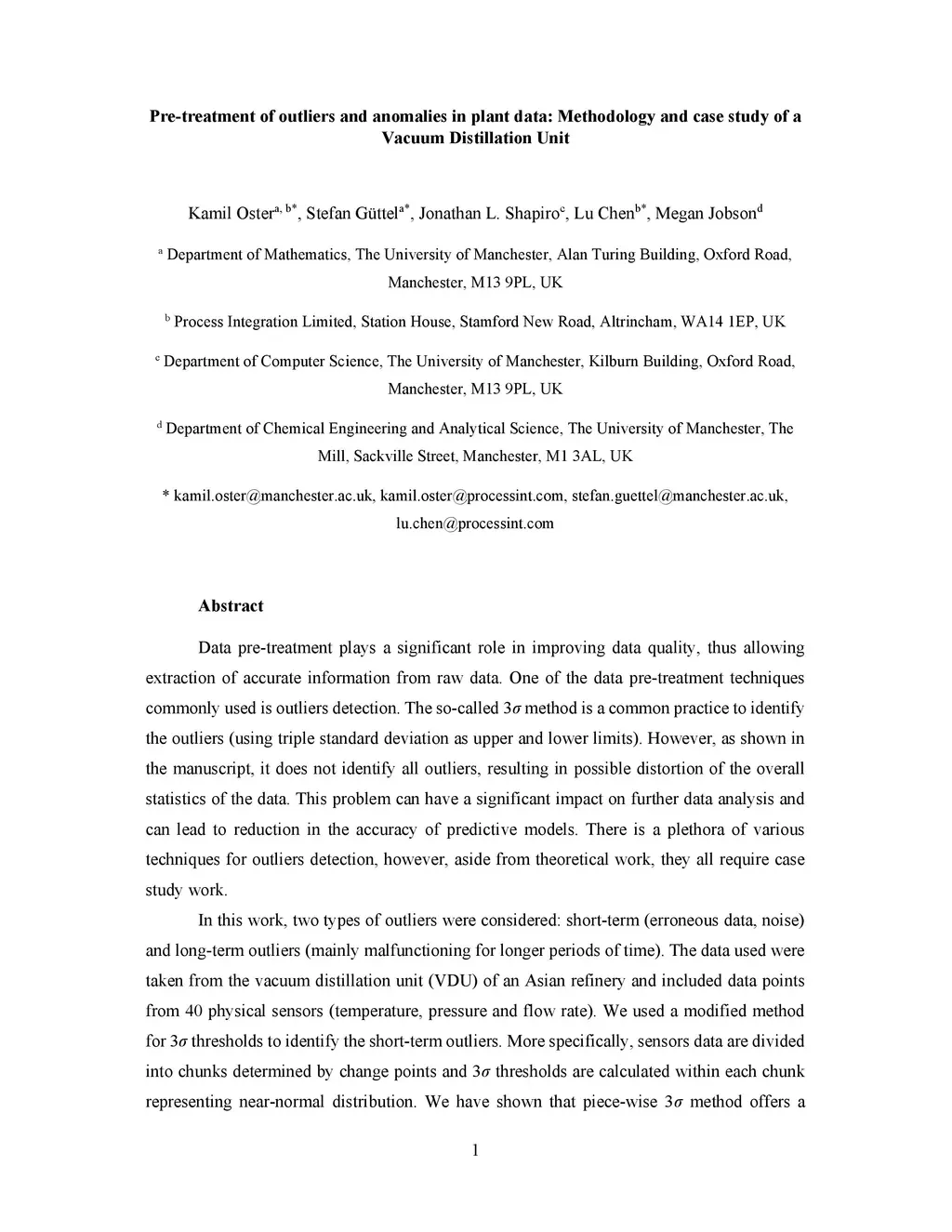 Data pre-treatment plays a significant role in improving data quality, thus allowing extraction of accurate information from raw data. One of the data pre-treatment techniques commonly used is outliers detection. The so-called 3 method is a common practice to identify the outliers. As shown in the manuscript, it does not identify all outliers, resulting in possible distortion of the overall statistics of the data. This problem can have a significant impact on further data analysis and can lead to reduction in the accuracy of predictive models. There is a plethora of various techniques for outliers detection, however, aside from theoretical work, they all require case study work. Two types of outliers were considered: short-term (erroneous data, noise) and long-term outliers (e.g. malfunctioning for longer periods). The data used were taken from the vacuum distillation unit (VDU) of an Asian refinery and included 40 physical sensors (temperature, pressure and flow rate). We used a modified method for 3 thresholds to identify the short-term outliers, i.e. ensors data are divided into chunks determined by change points and 3 thresholds are calculated within each chunk representing near-normal distribution. We have shown that piecewise 3 method offers a better approach to short-term outliers detection than 3 method applied to the entire time series. Nevertheless, this does not perform well for long-term outliers (which can represent another state in the data). In this case, we used principal component analysis (PCA) with Hotelling's statistics to identify the long-term outliers. The results obtained with PCA were subject to DBSCAN clustering method. The outliers (which were visually obvious and correctly detected by the PCA method) were also correctly identified by DBSCAN which supported the consistency and accuracy of the PCA method.