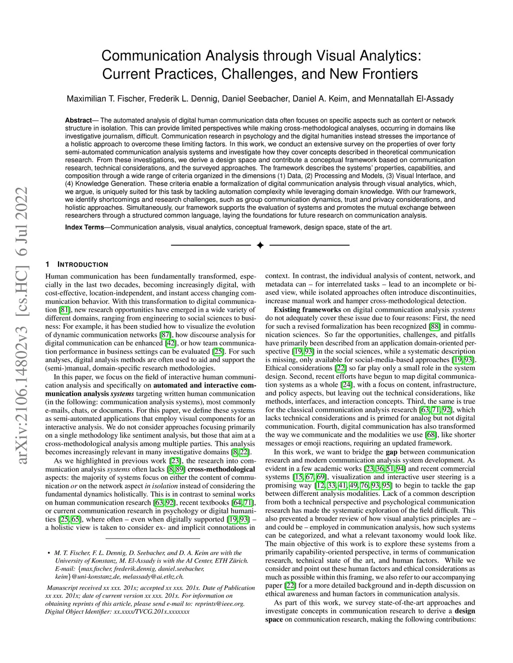 The automated analysis of digital human communication data often focuses on specific aspects such as content or network structure in isolation. This can provide limited perspectives while making cross-methodological analyses, occurring in domains like investigative journalism, difficult. Communication research in psychology and the digital humanities instead stresses the importance of a holistic approach to overcome these limiting factors. In this work, we conduct an extensive survey on the properties of over forty semi-automated communication analysis systems and investigate how they cover concepts described in theoretical communication research. From these investigations, we derive a design space and contribute a conceptual framework based on communication research, technical considerations, and the surveyed approaches. The framework describes the systems' properties, capabilities, and composition through a wide range of criteria organized in the dimensions (1) Data, (2) Processing and Models, (3) Visual Interface, and (4) Knowledge Generation. These criteria enable a formalization of digital communication analysis through visual analytics, which, we argue, is uniquely suited for this task by tackling automation complexity while leveraging domain knowledge. With our framework, we identify shortcomings and research challenges, such as group communication dynamics, trust and privacy considerations, and holistic approaches. Simultaneously, our framework supports the evaluation of systems and promotes the mutual exchange between researchers through a structured common language, laying the foundations for future research on communication analysis.