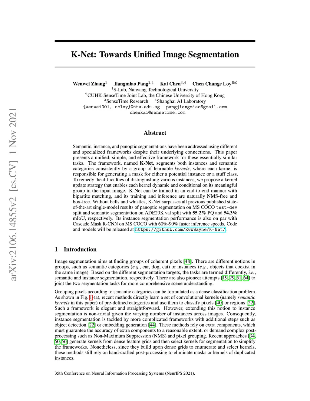 Semantic, instance, and panoptic segmentations have been addressed using different and specialized frameworks despite their underlying connections. This paper presents a unified, simple, and effective framework for these essentially similar tasks. The framework, named K-Net, segments both instances and semantic categories consistently by a group of learnable kernels, where each kernel is responsible for generating a mask for either a potential instance or a stuff class. To remedy the difficulties of distinguishing various instances, we propose a kernel update strategy that enables each kernel dynamic and conditional on its meaningful group in the input image. K-Net can be trained in an end-to-end manner with bipartite matching, and its training and inference are naturally NMS-free and box-free. Without bells and whistles, K-Net surpasses all previous published state-of-the-art single-model results of panoptic segmentation on MS COCO test-dev split and semantic segmentation on ADE20K val split with 55.2% PQ and 54.3% mIoU, respectively. Its instance segmentation performance is also on par with Cascade Mask R-CNN on MS COCO with 60%-90% faster inference speeds. Code and models will be released at https://github.com/ZwwWayne/K-Net/.