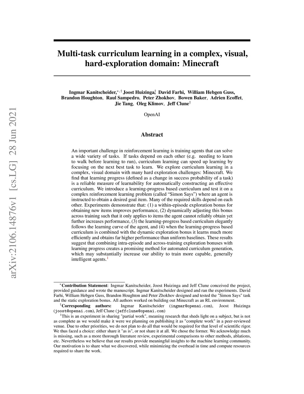 An important challenge in reinforcement learning is training agents that can solve a wide variety of tasks. If tasks depend on each other (e.g. needing to learn to walk before learning to run), curriculum learning can speed up learning by focusing on the next best task to learn. We explore curriculum learning in a complex, visual domain with many hard exploration challenges: Minecraft. We find that learning progress (defined as a change in success probability of a task) is a reliable measure of learnability for automatically constructing an effective curriculum. We introduce a learning-progress based curriculum and test it on a complex reinforcement learning problem (called "Simon Says") where an agent is instructed to obtain a desired goal item. Many of the required skills depend on each other. Experiments demonstrate that: (1) a within-episode exploration bonus for obtaining new items improves performance, (2) dynamically adjusting this bonus across training such that it only applies to items the agent cannot reliably obtain yet further increases performance, (3) the learning-progress based curriculum elegantly follows the learning curve of the agent, and (4) when the learning-progress based curriculum is combined with the dynamic exploration bonus it learns much more efficiently and obtains far higher performance than uniform baselines. These results suggest that combining intra-episode and across-training exploration bonuses with learning progress creates a promising method for automated curriculum generation, which may substantially increase our ability to train more capable, generally intelligent agents.