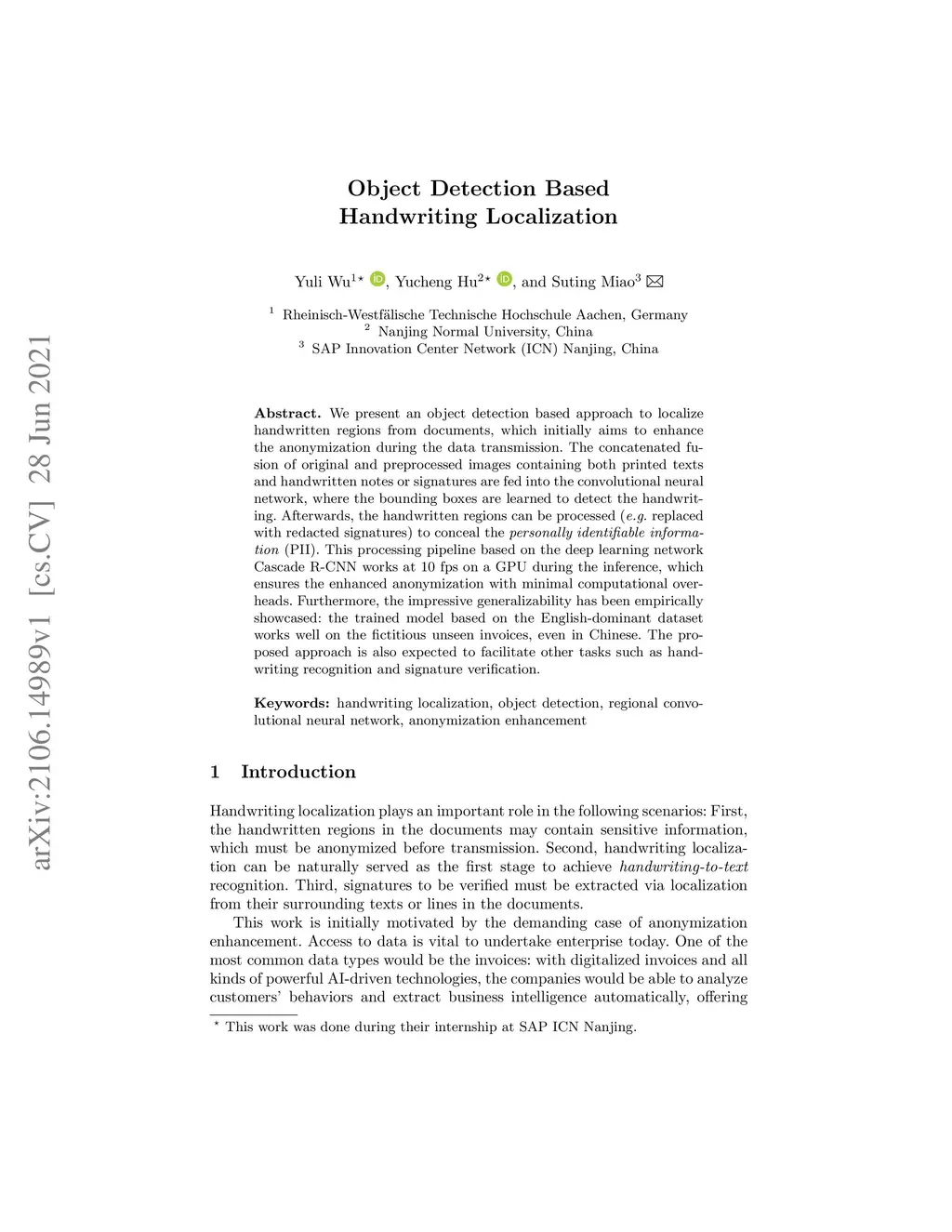 We present an object detection based approach to localize handwritten regions from documents, which initially aims to enhance the anonymization during the data transmission. The concatenated fusion of original and preprocessed images containing both printed texts and handwritten notes or signatures are fed into the convolutional neural network, where the bounding boxes are learned to detect the handwriting. Afterwards, the handwritten regions can be processed (e.g. replaced with redacted signatures) to conceal the personally identifiable information (PII). This processing pipeline based on the deep learning network Cascade R-CNN works at 10 fps on a GPU during the inference, which ensures the enhanced anonymization with minimal computational overheads. Furthermore, the impressive generalizability has been empirically showcased: the trained model based on the English-dominant dataset works well on the fictitious unseen invoices, even in Chinese. The proposed approach is also expected to facilitate other tasks such as handwriting recognition and signature verification.