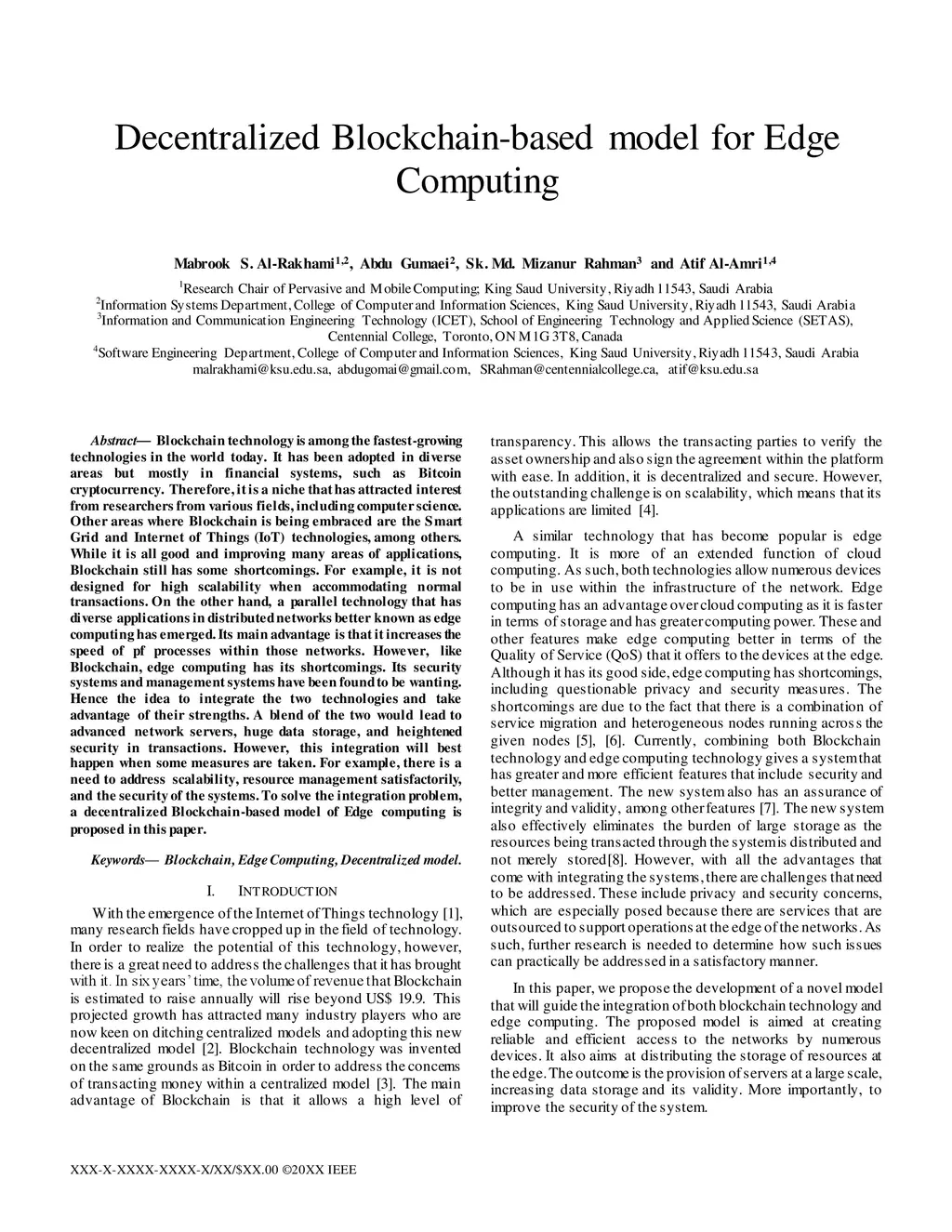 Blockchain technology is among the fastest-growing technologies in the world today. It has been adopted in diverse areas but mostly in financial systems, such as Bitcoin cryptocurrency. Therefore, it is a niche that has attracted interest from researchers from various fields, including computer science. Other areas where Blockchain is being embraced are the Smart Grid and Internet of Things (IoT) technologies, among others. While it is all good and improving many areas of applications, Blockchain still has some shortcomings. For example, it is not designed for high scalability when accommodating normal transactions. On the other hand, a parallel technology that has diverse applications in distributed networks better known as edge computing has emerged. Its main advantage is that it increases the speed of pf processes within those networks. However, like Blockchain, edge computing has its shortcomings. Its security systems and management systems have been found to be wanting. Hence the idea to integrate the two technologies and take advantage of their strengths. A blend of the two would lead to advanced network servers, huge data storage, and heightened security in transactions. However, this integration will best happen when some measures are taken. For example, there is a need to address scalability, resource management satisfactorily, and the security of the systems. To solve the integration problem, a decentralized Blockchain-based model of Edge computing is proposed in this paper.