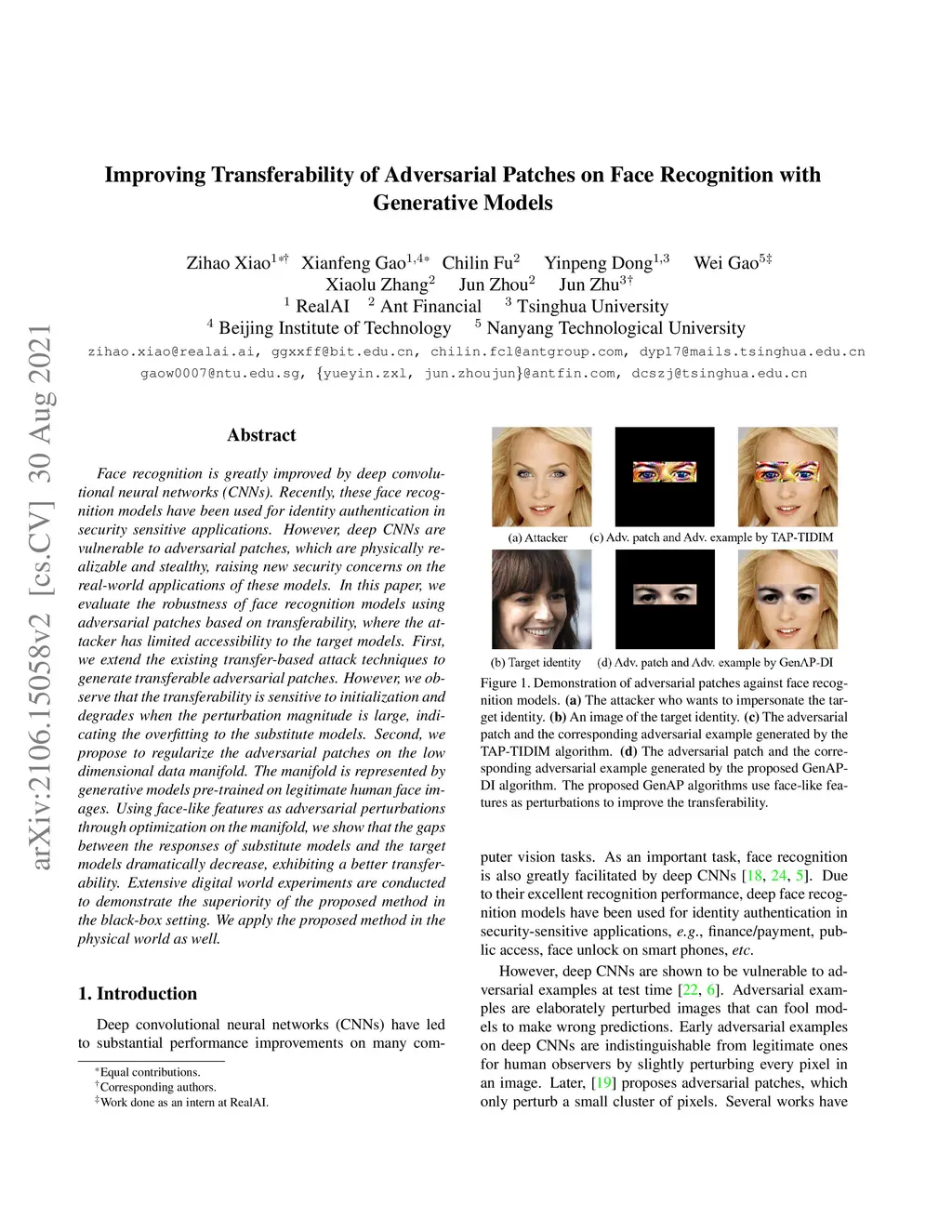 Face recognition is greatly improved by deep convolutional neural networks (CNNs). Recently, these face recognition models have been used for identity authentication in security sensitive applications. However, deep CNNs are vulnerable to adversarial patches, which are physically realizable and stealthy, raising new security concerns on the real-world applications of these models. In this paper, we evaluate the robustness of face recognition models using adversarial patches based on transferability, where the attacker has limited accessibility to the target models. First, we extend the existing transfer-based attack techniques to generate transferable adversarial patches. However, we observe that the transferability is sensitive to initialization and degrades when the perturbation magnitude is large, indicating the overfitting to the substitute models. Second, we propose to regularize the adversarial patches on the low dimensional data manifold. The manifold is represented by generative models pre-trained on legitimate human face images. Using face-like features as adversarial perturbations through optimization on the manifold, we show that the gaps between the responses of substitute models and the target models dramatically decrease, exhibiting a better transferability. Extensive digital world experiments are conducted to demonstrate the superiority of the proposed method in the black-box setting. We apply the proposed method in the physical world as well.