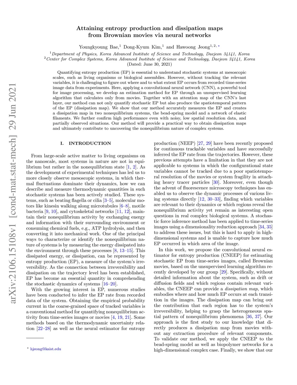 Quantifying entropy production (EP) is essential to understand stochastic systems at mesoscopic scales, such as living organisms or biological assemblies. However, without tracking the relevant variables, it is challenging to figure out where and to what extent EP occurs from recorded time-series image data from experiments. Here, applying a convolutional neural network (CNN), a powerful tool for image processing, we develop an estimation method for EP through an unsupervised learning algorithm that calculates only from movies. Together with an attention map of the CNN's last layer, our method can not only quantify stochastic EP but also produce the spatiotemporal pattern of the EP (dissipation map). We show that our method accurately measures the EP and creates a dissipation map in two nonequilibrium systems, the bead-spring model and a network of elastic filaments. We further confirm high performance even with noisy, low spatial resolution data, and partially observed situations. Our method will provide a practical way to obtain dissipation maps and ultimately contribute to uncovering the nonequilibrium nature of complex systems.
