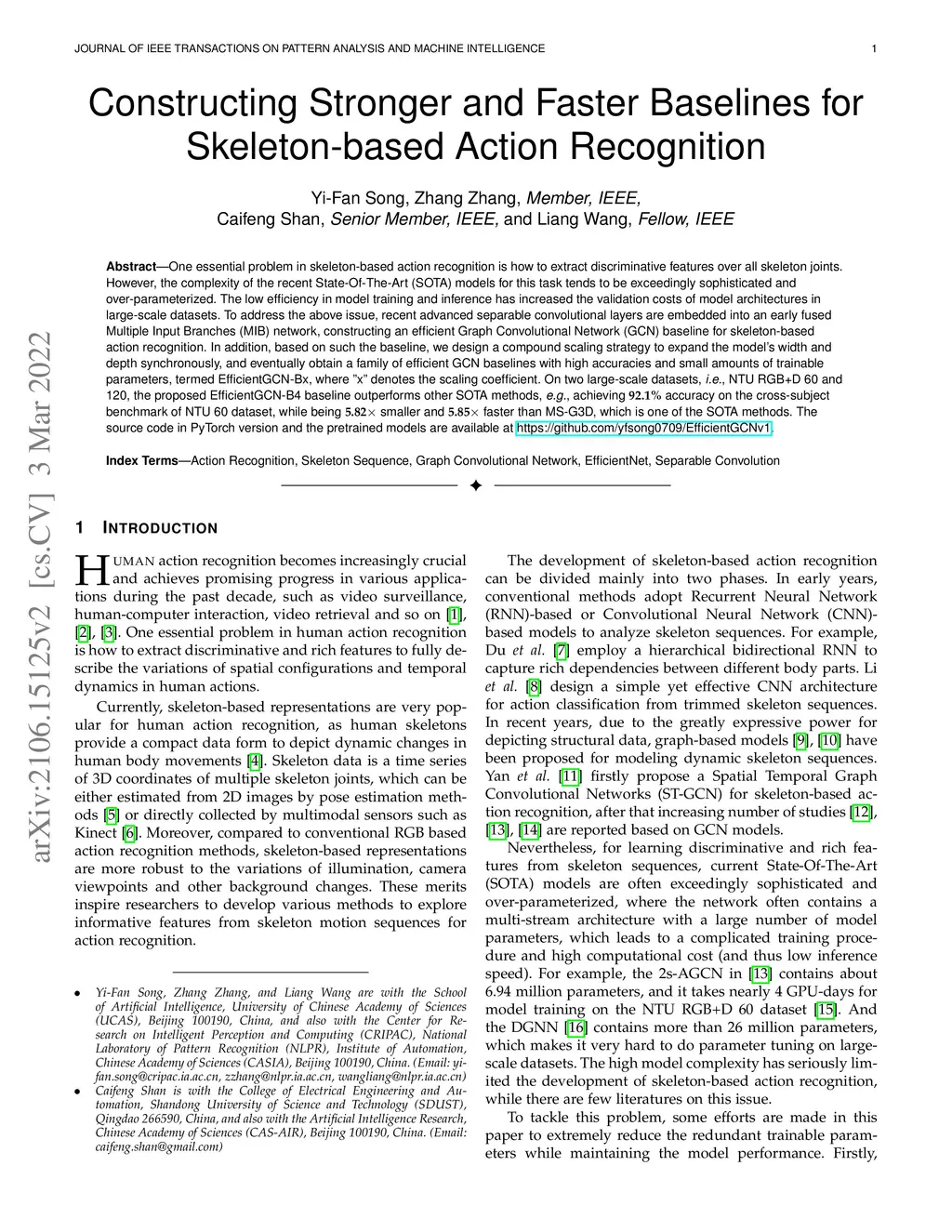 One essential problem in skeleton-based action recognition is how to extract discriminative features over all skeleton joints. However, the complexity of the recent State-Of-The-Art (SOTA) models for this task tends to be exceedingly sophisticated and over-parameterized. The low efficiency in model training and inference has increased the validation costs of model architectures in large-scale datasets. To address the above issue, recent advanced separable convolutional layers are embedded into an early fused Multiple Input Branches (MIB) network, constructing an efficient Graph Convolutional Network (GCN) baseline for skeleton-based action recognition. In addition, based on such the baseline, we design a compound scaling strategy to expand the model's width and depth synchronously, and eventually obtain a family of efficient GCN baselines with high accuracies and small amounts of trainable parameters, termed EfficientGCN-Bx, where "x" denotes the scaling coefficient. On two large-scale datasets, i.e., NTU RGB+D 60 and 120, the proposed EfficientGCN-B4 baseline outperforms other SOTA methods, e.g., achieving 91.7% accuracy on the cross-subject benchmark of NTU 60 dataset, while being 3.15x smaller and 3.21x faster than MS-G3D, which is one of the best SOTA methods. The source code in PyTorch version and the pretrained models are available at https://github.com/yfsong0709/EfficientGCNv1.