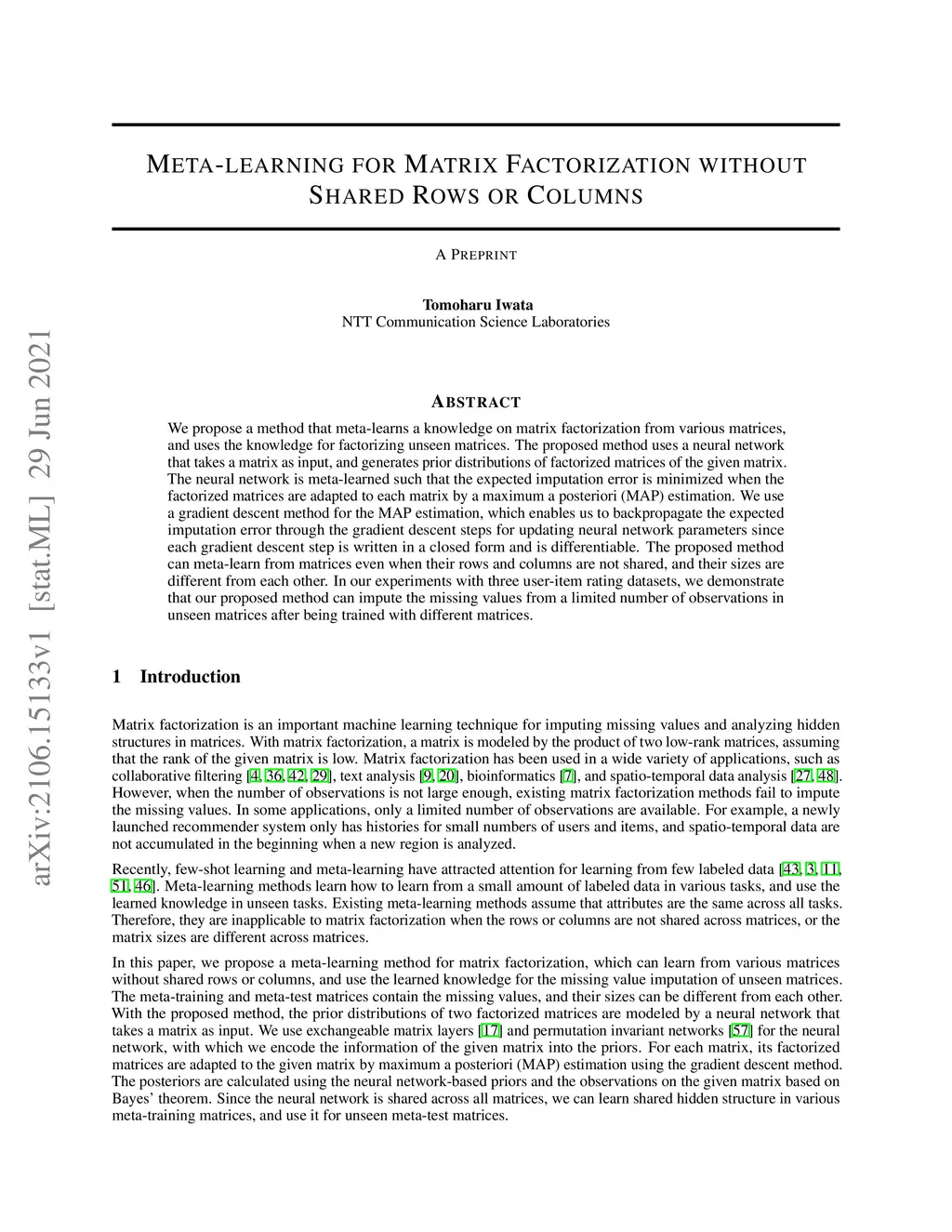 We propose a method that meta-learns a knowledge on matrix factorization from various matrices, and uses the knowledge for factorizing unseen matrices. The proposed method uses a neural network that takes a matrix as input, and generates prior distributions of factorized matrices of the given matrix. The neural network is meta-learned such that the expected imputation error is minimized when the factorized matrices are adapted to each matrix by a maximum a posteriori (MAP) estimation. We use a gradient descent method for the MAP estimation, which enables us to backpropagate the expected imputation error through the gradient descent steps for updating neural network parameters since each gradient descent step is written in a closed form and is differentiable. The proposed method can meta-learn from matrices even when their rows and columns are not shared, and their sizes are different from each other. In our experiments with three user-item rating datasets, we demonstrate that our proposed method can impute the missing values from a limited number of observations in unseen matrices after being trained with different matrices.