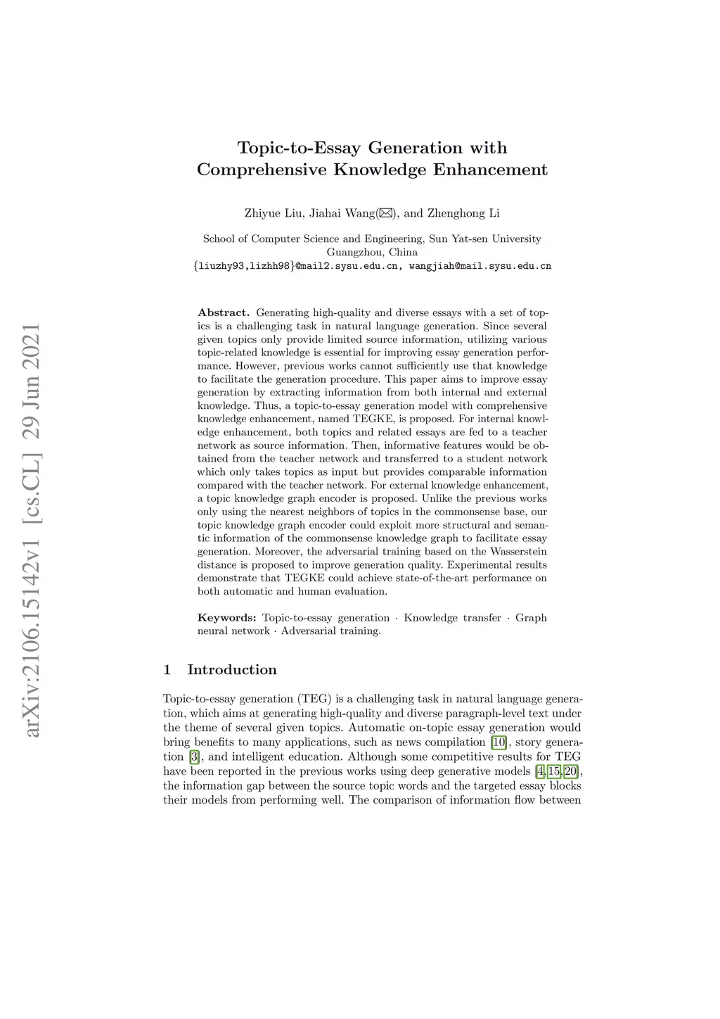 Generating high-quality and diverse essays with a set of topics is a challenging task in natural language generation. Since several given topics only provide limited source information, utilizing various topic-related knowledge is essential for improving essay generation performance. However, previous works cannot sufficiently use that knowledge to facilitate the generation procedure. This paper aims to improve essay generation by extracting information from both internal and external knowledge. Thus, a topic-to-essay generation model with comprehensive knowledge enhancement, named TEGKE, is proposed. For internal knowledge enhancement, both topics and related essays are fed to a teacher network as source information. Then, informative features would be obtained from the teacher network and transferred to a student network which only takes topics as input but provides comparable information compared with the teacher network. For external knowledge enhancement, a topic knowledge graph encoder is proposed. Unlike the previous works only using the nearest neighbors of topics in the commonsense base, our topic knowledge graph encoder could exploit more structural and semantic information of the commonsense knowledge graph to facilitate essay generation. Moreover, the adversarial training based on the Wasserstein distance is proposed to improve generation quality. Experimental results demonstrate that TEGKE could achieve state-of-the-art performance on both automatic and human evaluation.