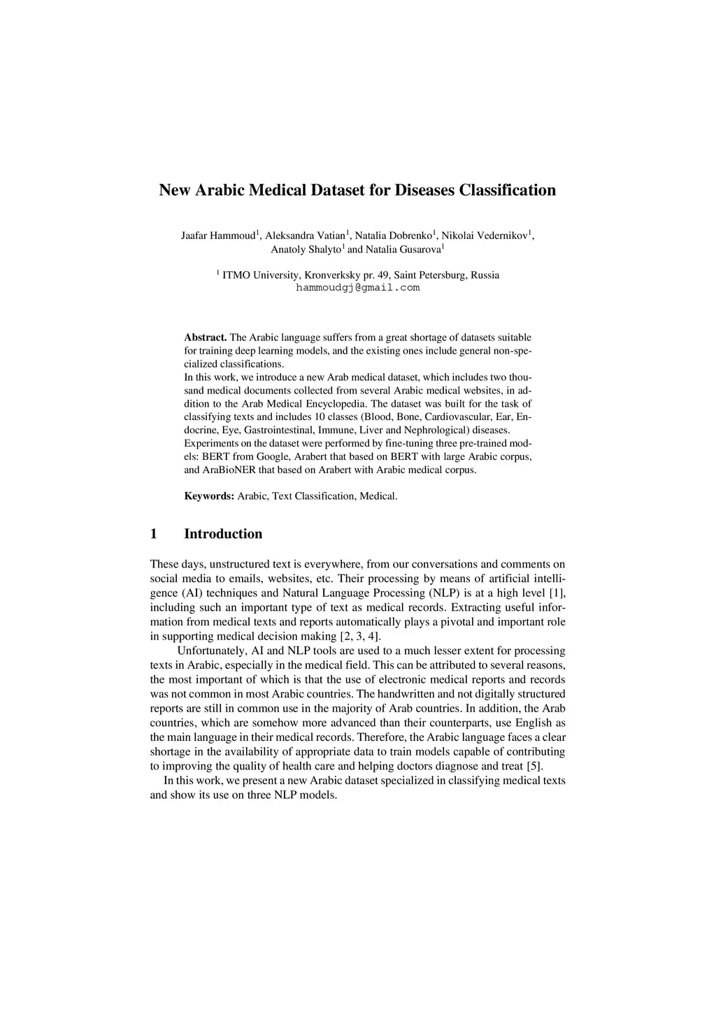 New Arabic Medical Dataset for Diseases Classification
