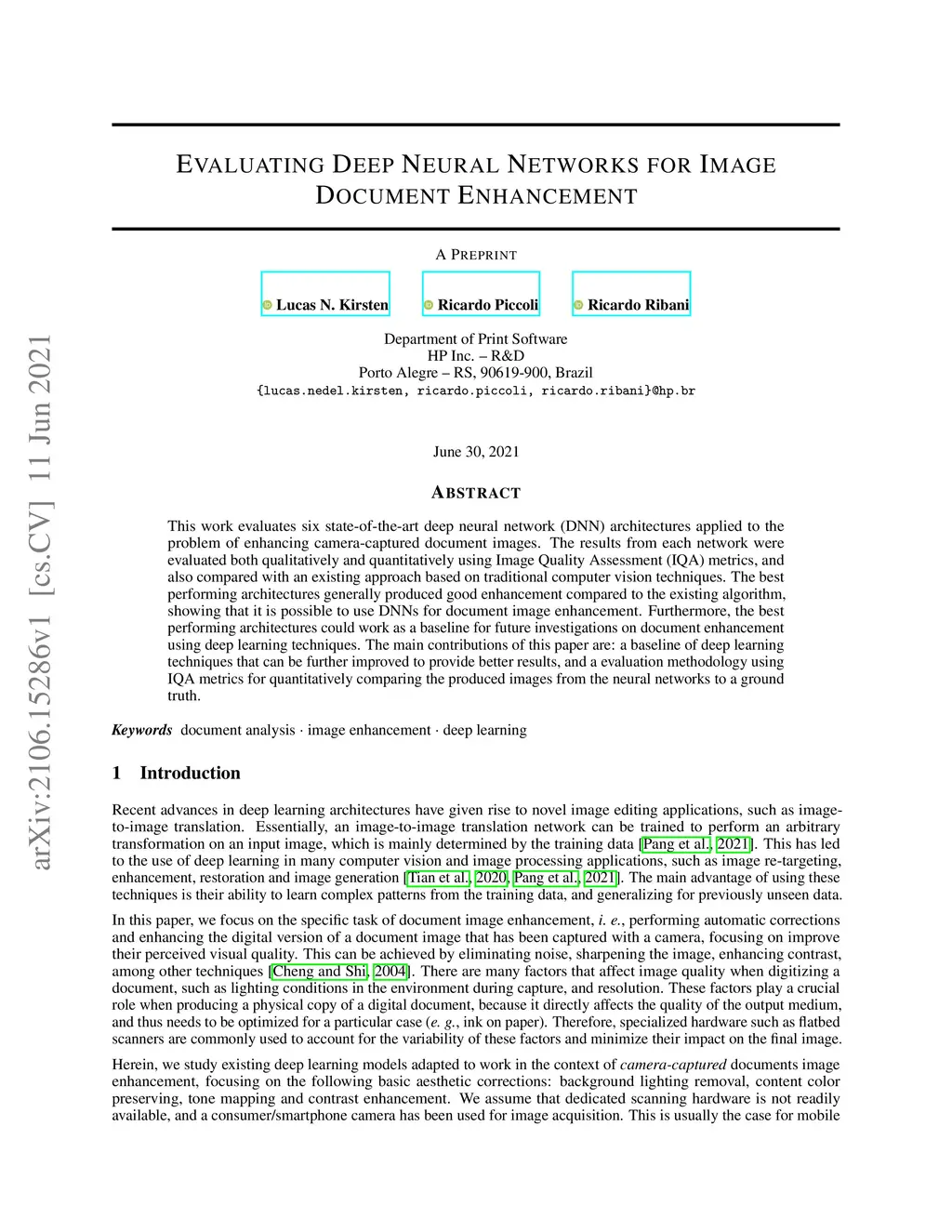 Evaluating Deep Neural Networks for Image Document Enhancement