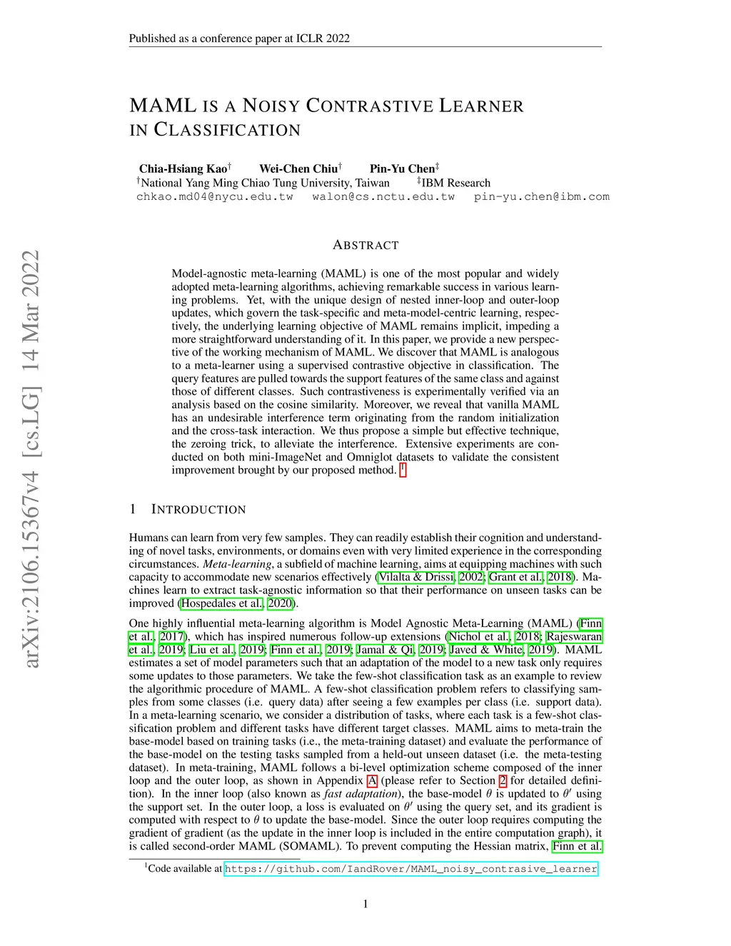 Model-agnostic meta-learning (MAML) is one of the most popular and widely adopted meta-learning algorithms, achieving remarkable success in various learning problems. Yet, with the unique design of nested inner-loop and outer-loop updates, which govern the task-specific and meta-model-centric learning, respectively, the underlying learning objective of MAML remains implicit and thus impedes a more straightforward understanding of it. In this paper, we provide a new perspective of the working mechanism of MAML. We discover that MAML is analogous to a meta-learner using a supervised contrastive objective. The query features are pulled towards the support features of the same class and against those of different classes. Such contrastiveness is experimentally verified via an analysis based on the cosine similarity. Moreover, we reveal that vanilla MAML has an undesirable interference term originating from the random initialization and the cross-task interaction. We thus propose a simple but effective technique, zeroing trick, to alleviate the interference. Extensive experiments are conducted on both mini-ImageNet and Omniglot datasets to demonstrate the consistent improvement brought by our proposed method, validating its effectiveness.