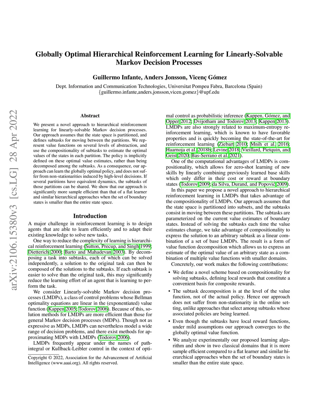 In this work we present a novel approach to hierarchical reinforcement learning for linearly-solvable Markov decision processes. Our approach assumes that the state space is partitioned, and the subtasks consist in moving between the partitions. We represent value functions on several levels of abstraction, and use the compositionality of subtasks to estimate the optimal values of the states in each partition. The policy is implicitly defined on these optimal value estimates, rather than being decomposed among the subtasks. As a consequence, our approach can learn the globally optimal policy, and does not suffer from the non-stationarity of high-level decisions. If several partitions have equivalent dynamics, the subtasks of those partitions can be shared. If the set of boundary states is smaller than the entire state space, our approach can have significantly smaller sample complexity than that of a flat learner, and we validate this empirically in several experiments.