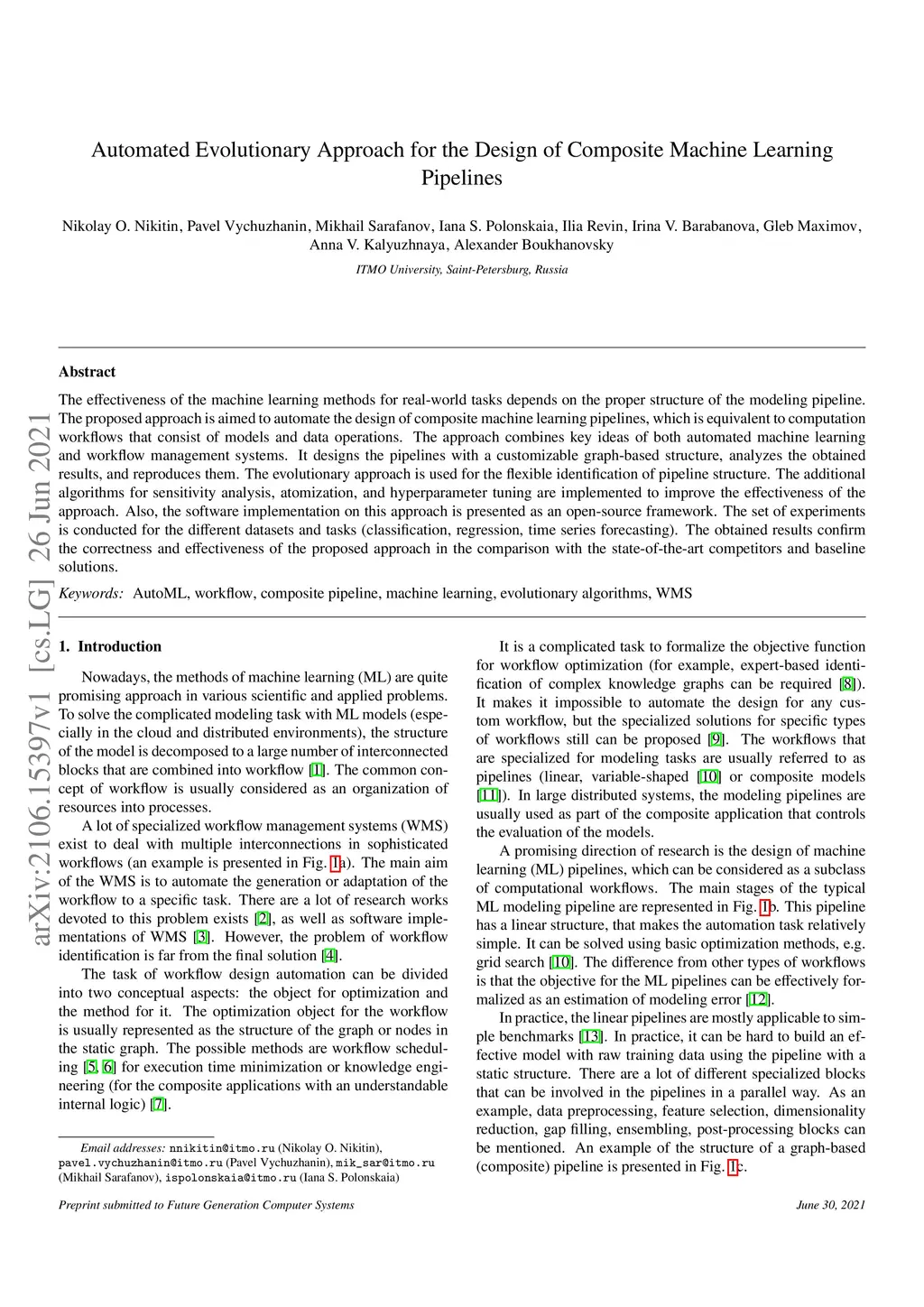 The effectiveness of the machine learning methods for real-world tasks depends on the proper structure of the modeling pipeline. The proposed approach is aimed to automate the design of composite machine learning pipelines, which is equivalent to computation workflows that consist of models and data operations. The approach combines key ideas of both automated machine learning and workflow management systems. It designs the pipelines with a customizable graph-based structure, analyzes the obtained results, and reproduces them. The evolutionary approach is used for the flexible identification of pipeline structure. The additional algorithms for sensitivity analysis, atomization, and hyperparameter tuning are implemented to improve the effectiveness of the approach. Also, the software implementation on this approach is presented as an open-source framework. The set of experiments is conducted for the different datasets and tasks (classification, regression, time series forecasting). The obtained results confirm the correctness and effectiveness of the proposed approach in the comparison with the state-of-the-art competitors and baseline solutions.