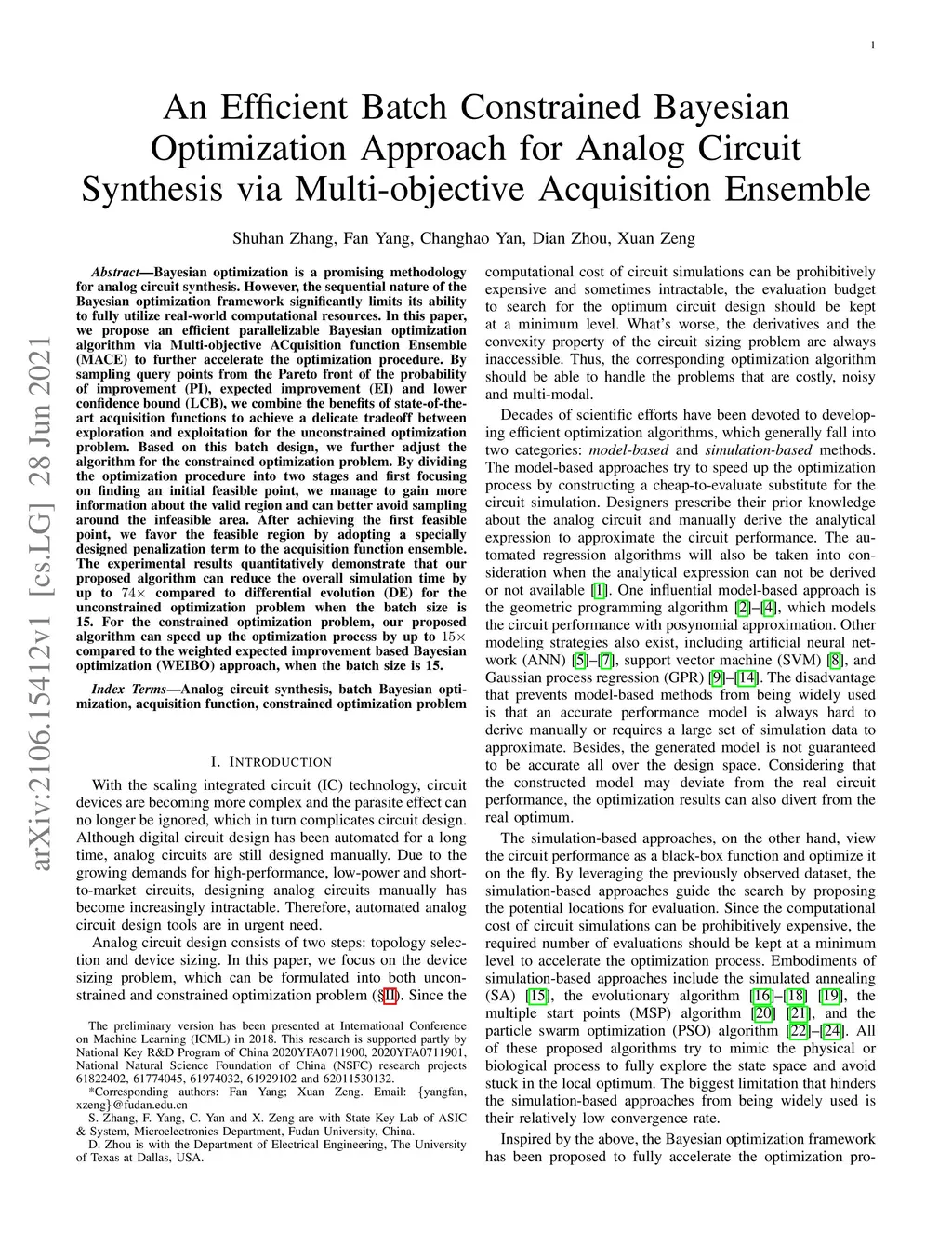 Bayesian optimization is a promising methodology for analog circuit synthesis. However, the sequential nature of the Bayesian optimization framework significantly limits its ability to fully utilize real-world computational resources. In this paper, we propose an efficient parallelizable Bayesian optimization algorithm via Multi-objective ACquisition function Ensemble (MACE) to further accelerate the optimization procedure. By sampling query points from the Pareto front of the probability of improvement (PI), expected improvement (EI) and lower confidence bound (LCB), we combine the benefits of state-of-the-art acquisition functions to achieve a delicate tradeoff between exploration and exploitation for the unconstrained optimization problem. Based on this batch design, we further adjust the algorithm for the constrained optimization problem. By dividing the optimization procedure into two stages and first focusing on finding an initial feasible point, we manage to gain more information about the valid region and can better avoid sampling around the infeasible area. After achieving the first feasible point, we favor the feasible region by adopting a specially designed penalization term to the acquisition function ensemble. The experimental results quantitatively demonstrate that our proposed algorithm can reduce the overall simulation time by up to 74 times compared to differential evolution (DE) for the unconstrained optimization problem when the batch size is 15. For the constrained optimization problem, our proposed algorithm can speed up the optimization process by up to 15 times compared to the weighted expected improvement based Bayesian optimization (WEIBO) approach, when the batch size is 15.