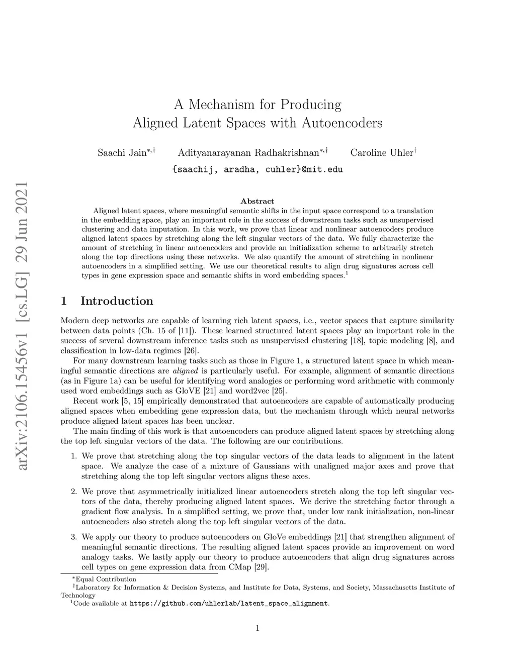 Aligned latent spaces, where meaningful semantic shifts in the input space correspond to a translation in the embedding space, play an important role in the success of downstream tasks such as unsupervised clustering and data imputation. In this work, we prove that linear and nonlinear autoencoders produce aligned latent spaces by stretching along the left singular vectors of the data. We fully characterize the amount of stretching in linear autoencoders and provide an initialization scheme to arbitrarily stretch along the top directions using these networks. We also quantify the amount of stretching in nonlinear autoencoders in a simplified setting. We use our theoretical results to align drug signatures across cell types in gene expression space and semantic shifts in word embedding spaces.