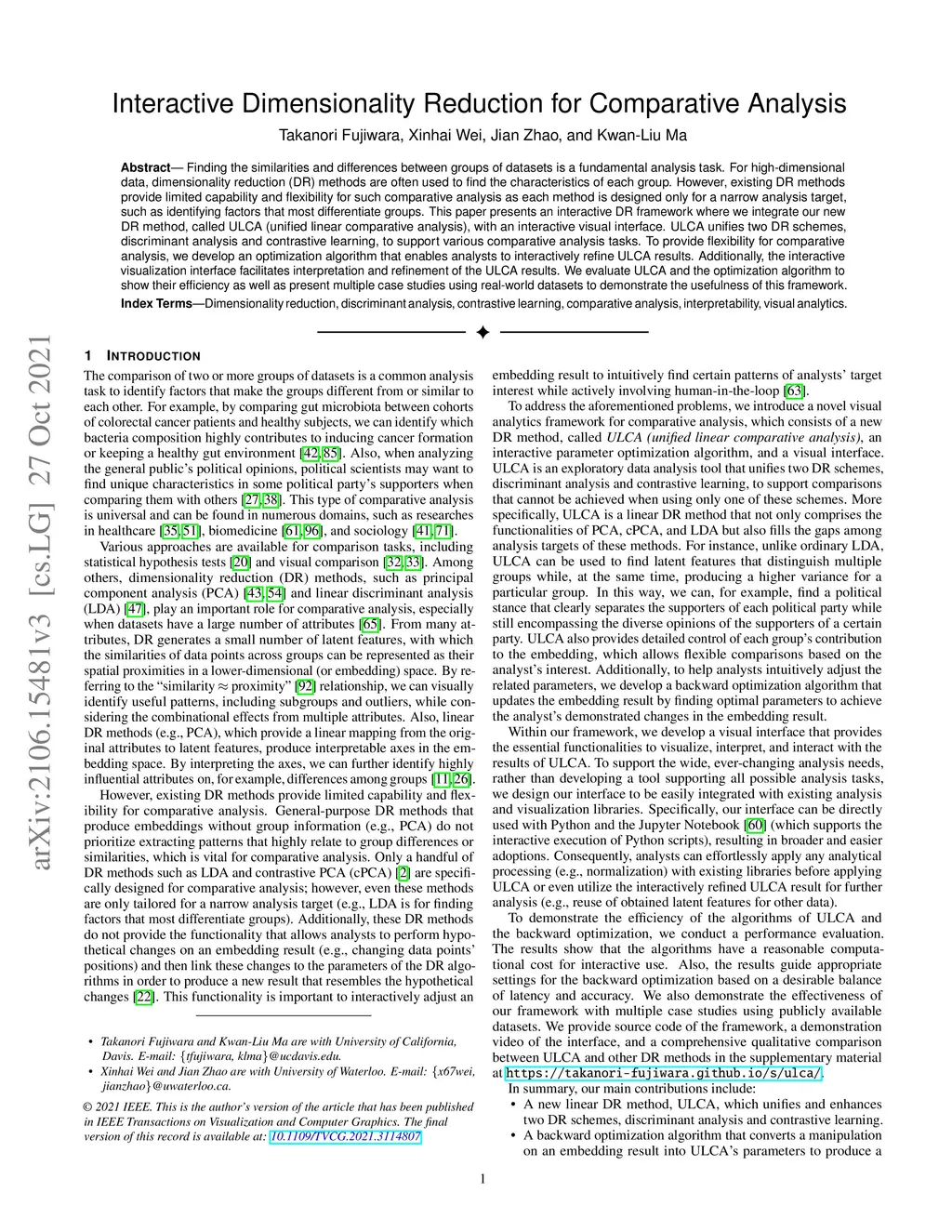 Finding the similarities and differences between groups of datasets is a fundamental analysis task. For high-dimensional data, dimensionality reduction (DR) methods are often used to find the characteristics of each group. However, existing DR methods provide limited capability and flexibility for such comparative analysis as each method is designed only for a narrow analysis target, such as identifying factors that most differentiate groups. This paper presents an interactive DR framework where we integrate our new DR method, called ULCA (unified linear comparative analysis), with an interactive visual interface. ULCA unifies two DR schemes, discriminant analysis and contrastive learning, to support various comparative analysis tasks. To provide flexibility for comparative analysis, we develop an optimization algorithm that enables analysts to interactively refine ULCA results. Additionally, the interactive visualization interface facilitates interpretation and refinement of the ULCA results. We evaluate ULCA and the optimization algorithm to show their efficiency as well as present multiple case studies using real-world datasets to demonstrate the usefulness of this framework.