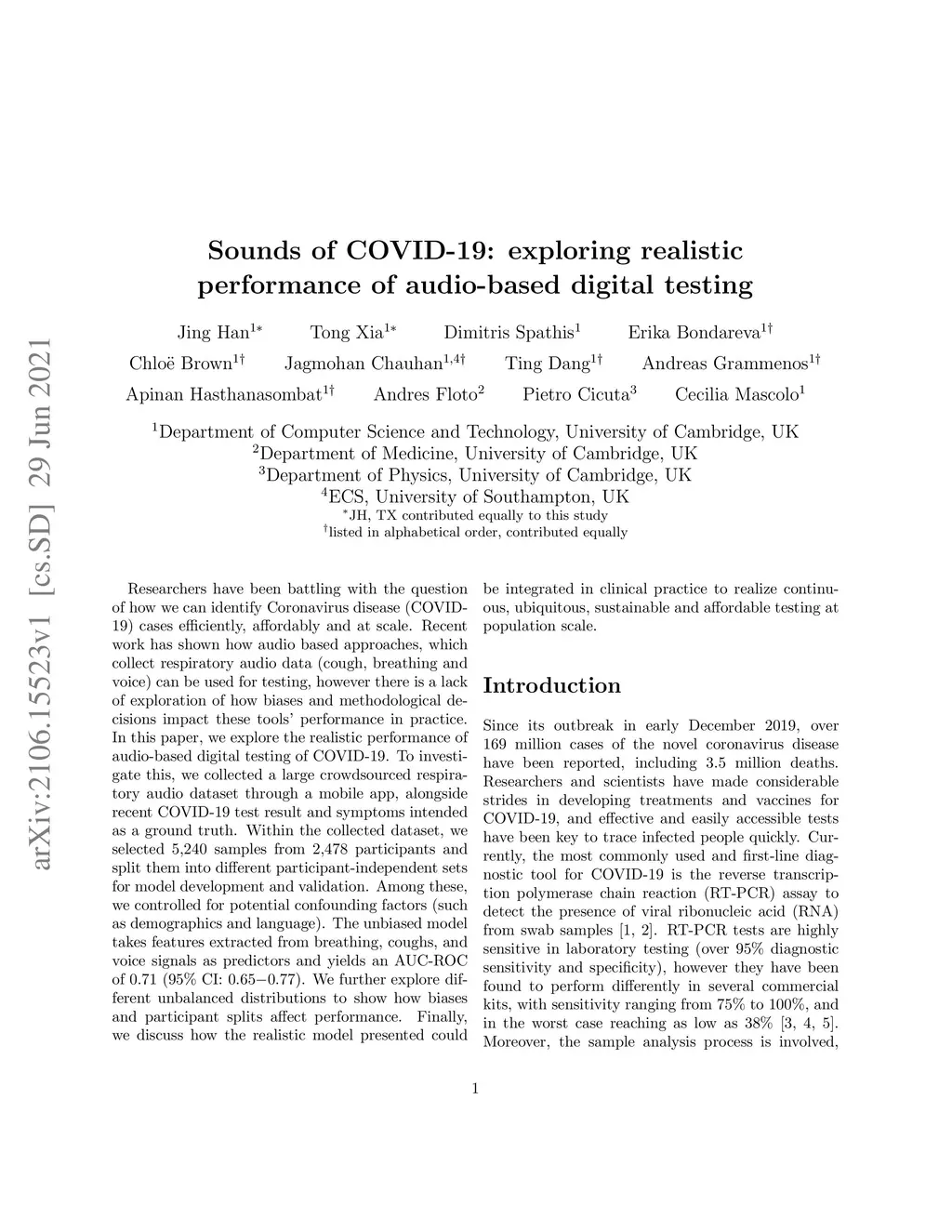 Researchers have been battling with the question of how we can identify Coronavirus disease (COVID-19) cases efficiently, affordably and at scale. Recent work has shown how audio based approaches, which collect respiratory audio data (cough, breathing and voice) can be used for testing, however there is a lack of exploration of how biases and methodological decisions impact these tools' performance in practice. In this paper, we explore the realistic performance of audio-based digital testing of COVID-19. To investigate this, we collected a large crowdsourced respiratory audio dataset through a mobile app, alongside recent COVID-19 test result and symptoms intended as a ground truth. Within the collected dataset, we selected 5,240 samples from 2,478 participants and split them into different participant-independent sets for model development and validation. Among these, we controlled for potential confounding factors (such as demographics and language). The unbiased model takes features extracted from breathing, coughs, and voice signals as predictors and yields an AUC-ROC of 0.71 (95\% CI: 0.650.77). We further explore different unbalanced distributions to show how biases and participant splits affect performance. Finally, we discuss how the realistic model presented could be integrated in clinical practice to realize continuous, ubiquitous, sustainable and affordable testing at population scale.