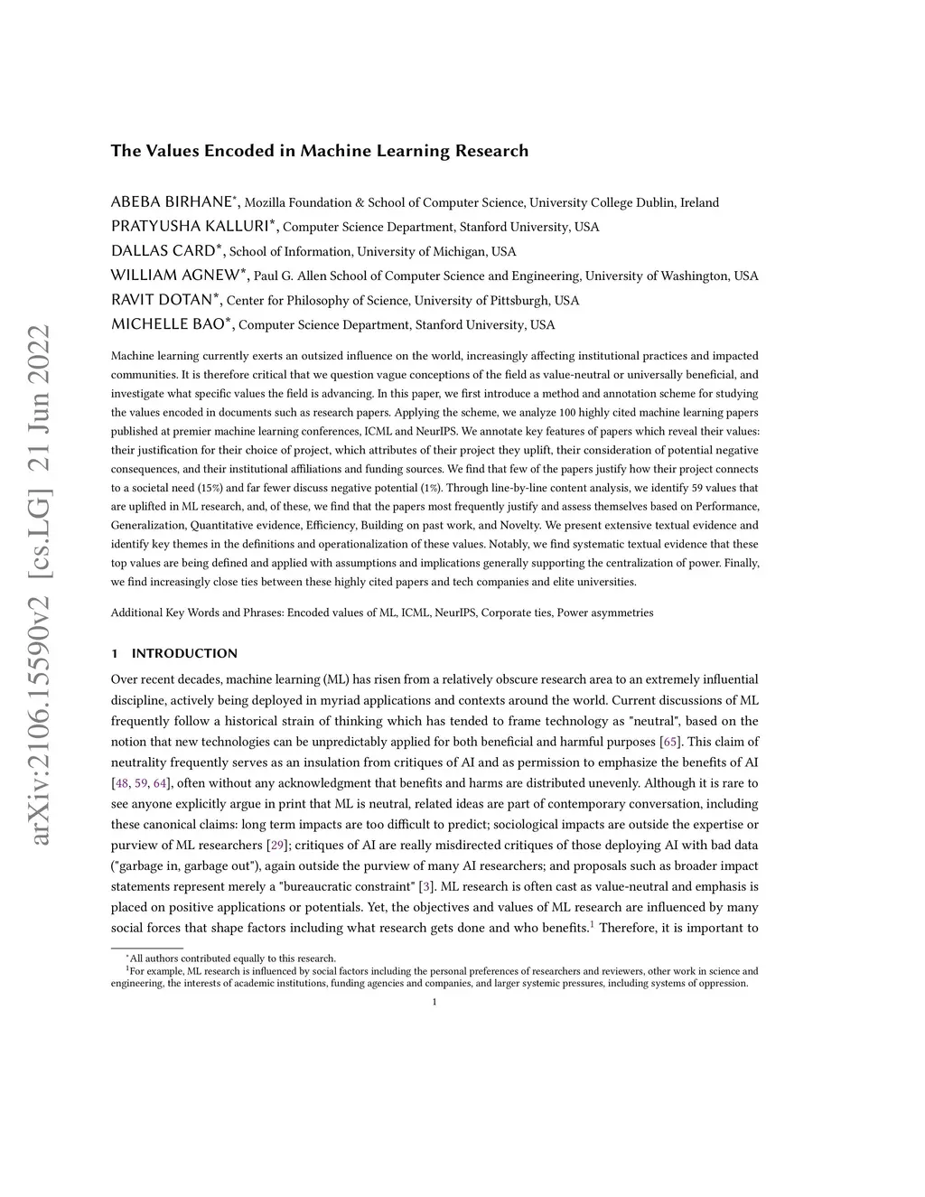 Machine learning (ML) currently exerts an outsized influence on the world, increasingly affecting communities and institutional practices. It is therefore critical that we question vague conceptions of the field as value-neutral or universally beneficial, and investigate what specific values the field is advancing. In this paper, we present a rigorous examination of the values of the field by quantitatively and qualitatively analyzing 100 highly cited ML papers published at premier ML conferences, ICML and NeurIPS. We annotate key features of papers which reveal their values: how they justify their choice of project, which aspects they uplift, their consideration of potential negative consequences, and their institutional affiliations and funding sources. We find that societal needs are typically very loosely connected to the choice of project, if mentioned at all, and that consideration of negative consequences is extremely rare. We identify 67 values that are uplifted in machine learning research, and, of these, we find that papers most frequently justify and assess themselves based on performance, generalization, efficiency, researcher understanding, novelty, and building on previous work. We present extensive textual evidence and analysis of how these values are operationalized. Notably, we find that each of these top values is currently being defined and applied with assumptions and implications generally supporting the centralization of power. Finally, we find increasingly close ties between these highly cited papers and tech companies and elite universities.