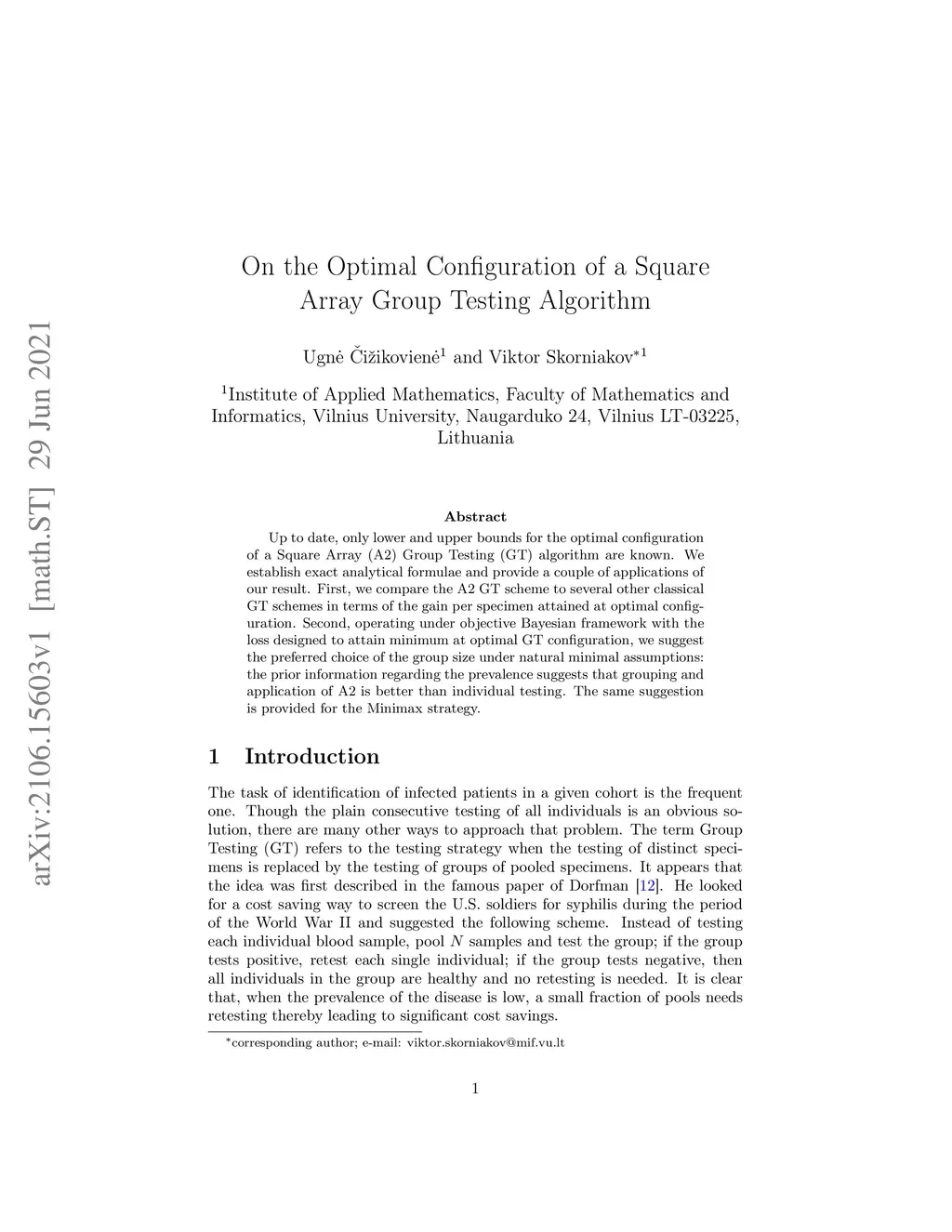 Up to date, only lower and upper bounds for the optimal configuration of a Square Array (A2) Group Testing (GT) algorithm are known. We establish exact analytical formulae and provide a couple of applications of our result. First, we compare the A2 GT scheme to several other classical GT schemes in terms of the gain per specimen attained at optimal configuration. Second, operating under objective Bayesian framework with the loss designed to attain minimum at optimal GT configuration, we suggest the preferred choice of the group size under natural minimal assumptions: the prior information regarding the prevalence suggests that grouping and application of A2 is better than individual testing. The same suggestion is provided for the Minimax strategy.