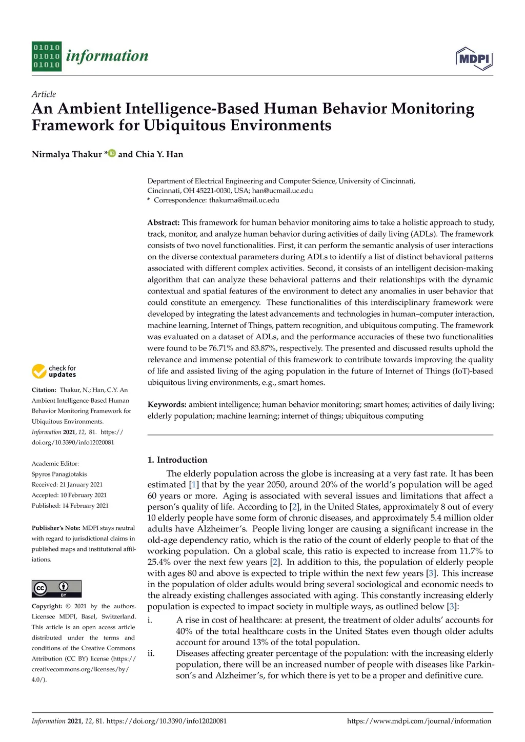 This framework for human behavior monitoring aims to take a holistic approach to study, track, monitor, and analyze human behavior during activities of daily living (ADLs). The framework consists of two novel functionalities. First, it can perform the semantic analysis of user interactions on the diverse contextual parameters during ADLs to identify a list of distinct behavioral patterns associated with different complex activities. Second, it consists of an intelligent decision-making algorithm that can analyze these behavioral patterns and their relationships with the dynamic contextual and spatial features of the environment to detect any anomalies in user behavior that could constitute an emergency. These functionalities of this interdisciplinary framework were developed by integrating the latest advancements and technologies in human-computer interaction, machine learning, Internet of Things, pattern recognition, and ubiquitous computing. The framework was evaluated on a dataset of ADLs, and the performance accuracies of these two functionalities were found to be 76.71% and 83.87%, respectively. The presented and discussed results uphold the relevance and immense potential of this framework to contribute towards improving the quality of life and assisted living of the aging population in the future of Internet of Things (IoT)-based ubiquitous living environments, e.g., smart homes.