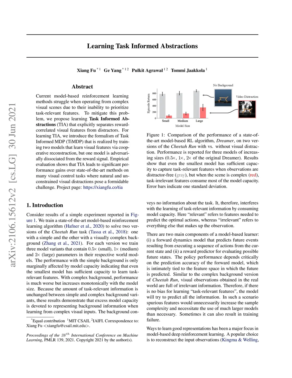 Current model-based reinforcement learning methods struggle when operating from complex visual scenes due to their inability to prioritize task-relevant features. To mitigate this problem, we propose learning Task Informed Abstractions (TIA) that explicitly separates reward-correlated visual features from distractors. For learning TIA, we introduce the formalism of Task Informed MDP (TiMDP) that is realized by training two models that learn visual features via cooperative reconstruction, but one model is adversarially dissociated from the reward signal. Empirical evaluation shows that TIA leads to significant performance gains over state-of-the-art methods on many visual control tasks where natural and unconstrained visual distractions pose a formidable challenge.