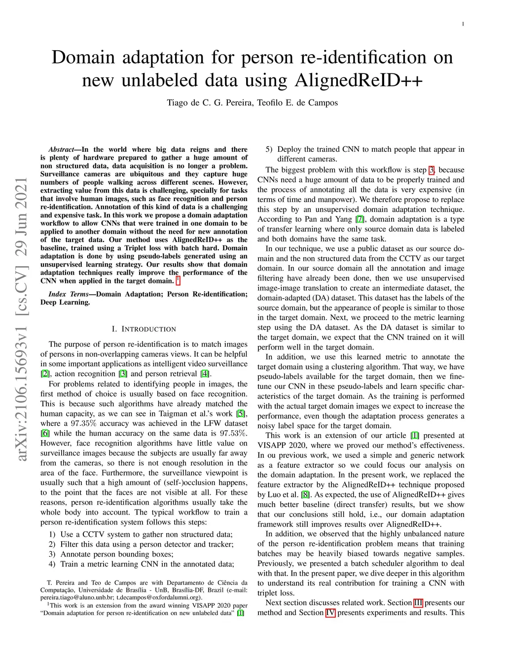 In the world where big data reigns and there is plenty of hardware prepared to gather a huge amount of non structured data, data acquisition is no longer a problem. Surveillance cameras are ubiquitous and they capture huge numbers of people walking across different scenes. However, extracting value from this data is challenging, specially for tasks that involve human images, such as face recognition and person re-identification. Annotation of this kind of data is a challenging and expensive task. In this work we propose a domain adaptation workflow to allow CNNs that were trained in one domain to be applied to another domain without the need for new annotation of the target data. Our method uses AlignedReID++ as the baseline, trained using a Triplet loss with batch hard. Domain adaptation is done by using pseudo-labels generated using an unsupervised learning strategy. Our results show that domain adaptation techniques really improve the performance of the CNN when applied in the target domain.