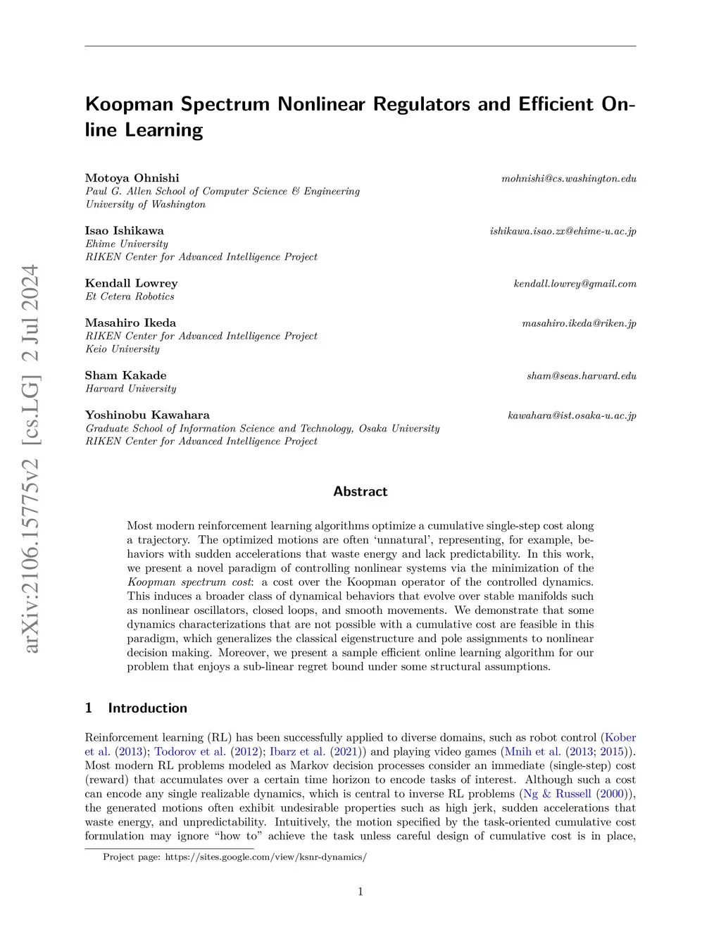 Most modern reinforcement learning algorithms optimize a cumulative single-step cost along a trajectory. The optimized motions are often únnatural', representing, for example, behaviors with sudden accelerations that waste energy and lack predictability. In this work, we present a novel paradigm of controlling nonlinear systems via the minimization of the Koopman spectrum cost: a cost over the Koopman operator of the controlled dynamics. This induces a broader class of dynamical behaviors that evolve over stable manifolds such as nonlinear oscillators, closed loops, and smooth movements. We demonstrate that some dynamics characterizations that are not possible with a cumulative cost are feasible in this paradigm, which generalizes the classical eigenstructure and pole assignments to nonlinear decision making. Moreover, we present a sample efficient online learning algorithm for our problem that enjoys a sub-linear regret bound under some structural assumptions.