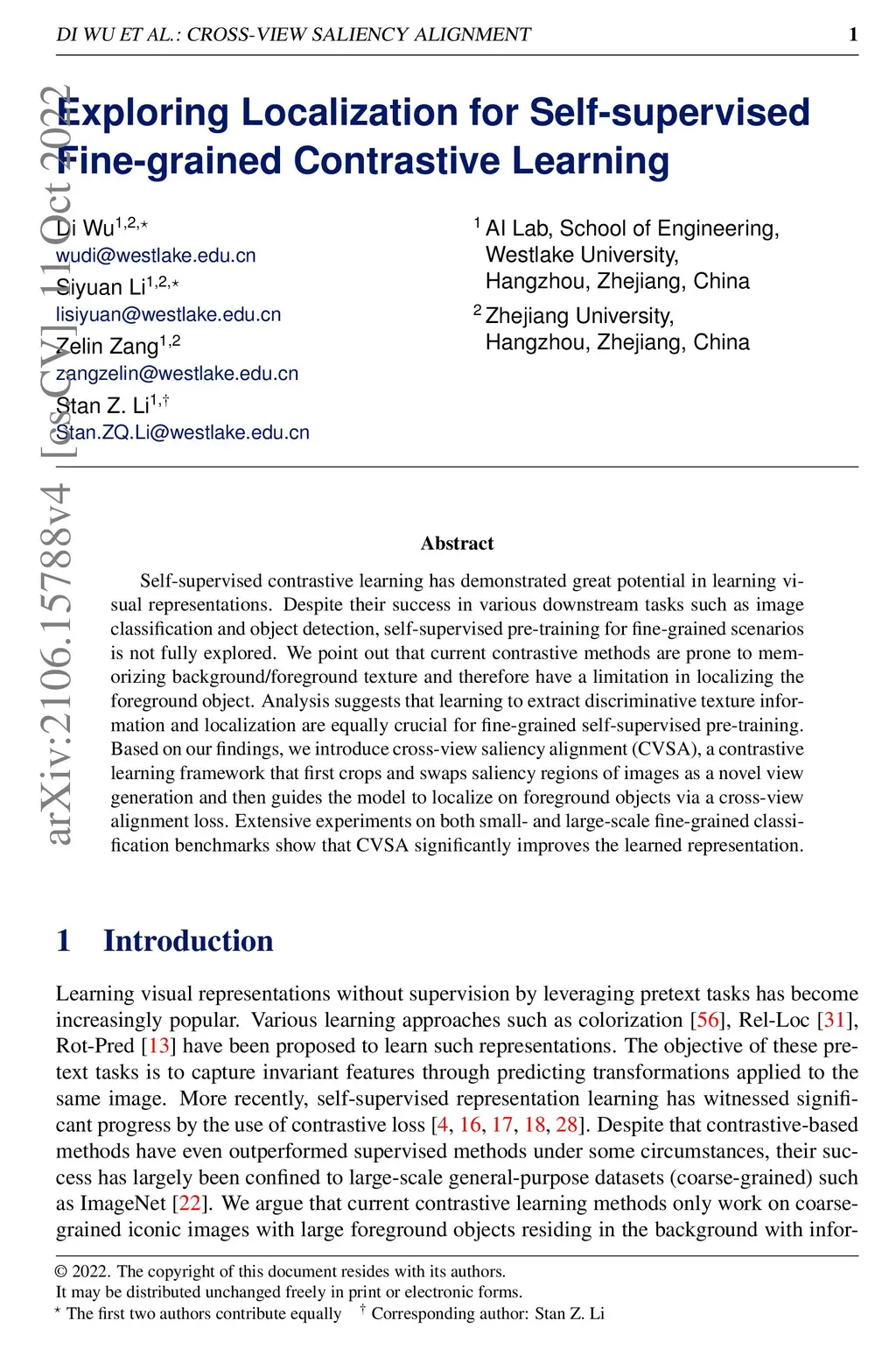 Self-supervised contrastive learning has demonstrated great potential in learning visual representations. Despite their success in various downstream tasks such as image classification and object detection, self-supervised pre-training for fine-grained scenarios is not fully explored. We point out that current contrastive methods are prone to memorizing background/foreground texture and therefore have a limitation in localizing the foreground object. Analysis suggests that learning to extract discriminative texture information and localization are equally crucial for fine-grained self-supervised pre-training. Based on our findings, we introduce cross-view saliency alignment (CVSA), a contrastive learning framework that first crops and swaps saliency regions of images as a novel view generation and then guides the model to localize on foreground objects via a cross-view alignment loss. Extensive experiments on both small- and large-scale fine-grained classification benchmarks show that CVSA significantly improves the learned representation.