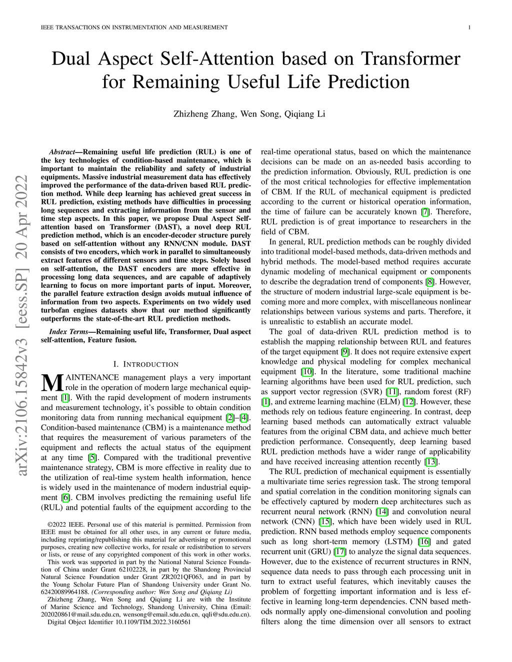 Remaining useful life prediction (RUL) is one of the key technologies of condition-based maintenance, which is important to maintain the reliability and safety of industrial equipments. Massive industrial measurement data has effectively improved the performance of the data-driven based RUL prediction method. While deep learning has achieved great success in RUL prediction, existing methods have difficulties in processing long sequences and extracting information from the sensor and time step aspects. In this paper, we propose Dual Aspect Self-attention based on Transformer (DAST), a novel deep RUL prediction method, which is an encoder-decoder structure purely based on self-attention without any RNN/CNN module. DAST consists of two encoders, which work in parallel to simultaneously extract features of different sensors and time steps. Solely based on self-attention, the DAST encoders are more effective in processing long data sequences, and are capable of adaptively learning to focus on more important parts of input. Moreover, the parallel feature extraction design avoids mutual influence of information from two aspects. Experiments on two widely used turbofan engines datasets show that our method significantly outperforms the state-of-the-art RUL prediction methods.