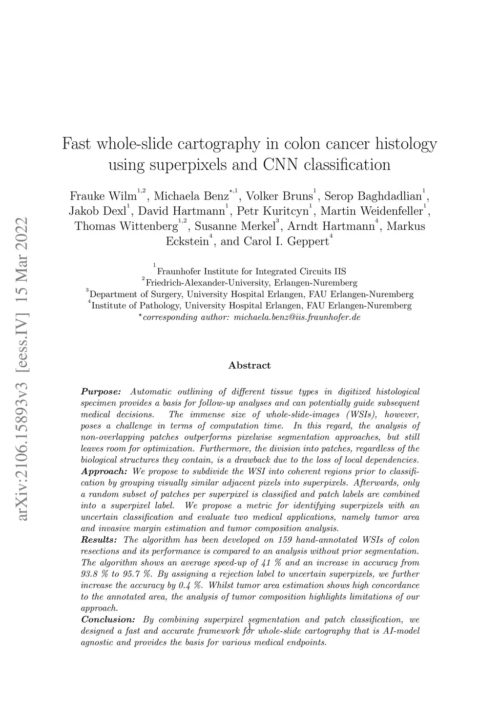 Automatic outlining of different tissue types in digitized histological specimen provides a basis for follow-up analyses and can potentially guide subsequent medical decisions. The immense size of whole-slide-images (WSI), however, poses a challenge in terms of computation time. In this regard, the analysis of non-overlapping patches outperforms pixelwise segmentation approaches, but still leaves room for optimization. Furthermore, the division into patches, regardless of the biological structures they contain, is a drawback due to the loss of local dependencies. We propose to subdivide the WSI into coherent regions prior to classification by grouping visually similar adjacent pixels into superpixels. Afterwards, only a random subset of patches per superpixel is classified and patch labels are combined into a superpixel label. We propose a metric for identifying superpixels with an uncertain classification and evaluate two medical applications, namely tumor area and invasive margin estimation and tumor composition analysis. The algorithm has been developed on 159 hand-annotated WSIs of colon resections and its performance is compared to an analysis without prior segmentation. The algorithm shows an average speed-up of 41% and an increase in accuracy from 93.8% to 95.7%. By assigning a rejection label to uncertain superpixels, we further increase the accuracy by 0.4%. Whilst tumor area estimation shows high concordance to the annotated area, the analysis of tumor composition highlights limitations of our approach. By combining superpixel segmentation and patch classification, we designed a fast and accurate framework for whole-slide cartography that is AI-model agnostic and provides the basis for various medical endpoints.