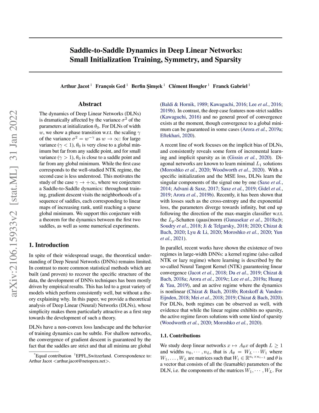 The dynamics of Deep Linear Networks (DLNs) is dramatically affected by the variance of the parameters at initialization . For DLNs of width , we show a phase transition w.r.t. the scaling of the variance as : for large variance (), is very close to a global minimum but far from any saddle point, and for small variance (), is close to a saddle point and far from any global minimum. While the first case corresponds to the well-studied NTK regime, the second case is less understood. This motivates the study of the case , where we conjecture a Saddle-to-Saddle dynamics: throughout training, gradient descent visits the neighborhoods of a sequence of saddles, each corresponding to linear maps of increasing rank, until reaching a sparse global minimum. We support this conjecture with a theorem for the dynamics between the first two saddles, as well as some numerical experiments.