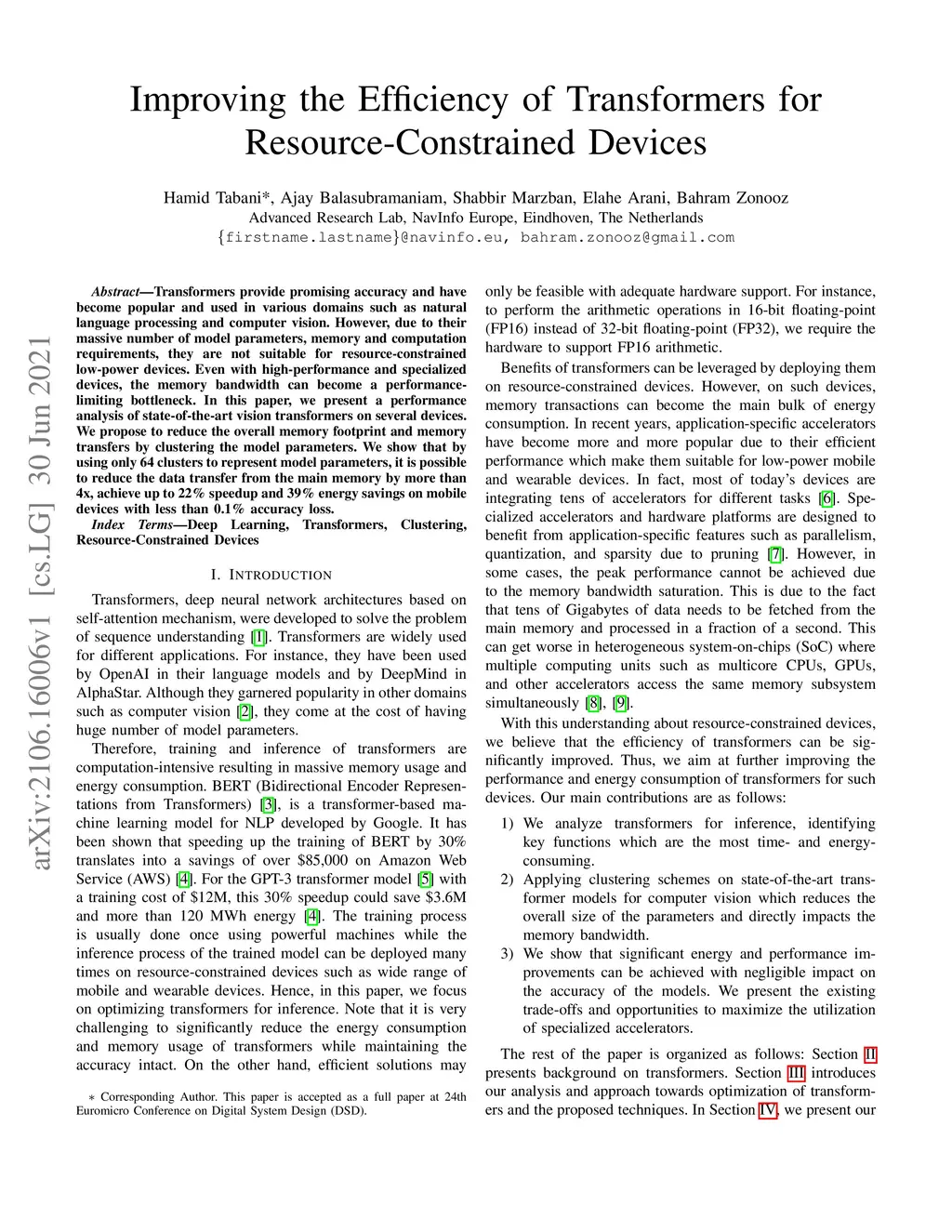 Transformers provide promising accuracy and have become popular and used in various domains such as natural language processing and computer vision. However, due to their massive number of model parameters, memory and computation requirements, they are not suitable for resource-constrained low-power devices. Even with high-performance and specialized devices, the memory bandwidth can become a performance-limiting bottleneck. In this paper, we present a performance analysis of state-of-the-art vision transformers on several devices. We propose to reduce the overall memory footprint and memory transfers by clustering the model parameters. We show that by using only 64 clusters to represent model parameters, it is possible to reduce the data transfer from the main memory by more than 4x, achieve up to 22% speedup and 39% energy savings on mobile devices with less than 0.1% accuracy loss.