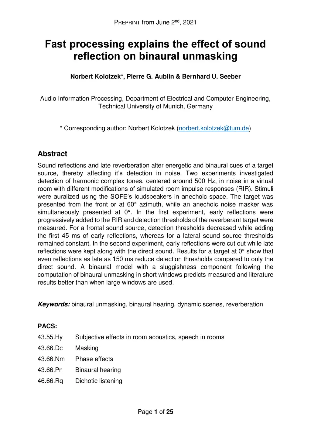 Fast processing explains the effect of sound reflection on binaural