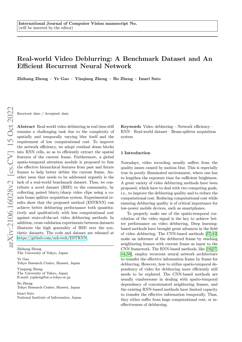 Real-world video deblurring in real time still remains a challenging task due to the complexity of spatially and temporally varying blur itself and the requirement of low computational cost. To improve the network efficiency, we adopt residual dense blocks into RNN cells, so as to efficiently extract the spatial features of the current frame. Furthermore, a global spatio-temporal attention module is proposed to fuse the effective hierarchical features from past and future frames to help better deblur the current frame. Another issue that needs to be addressed urgently is the lack of a real-world benchmark dataset. Thus, we contribute a novel dataset (BSD) to the community, by collecting paired blurry/sharp video clips using a co-axis beam splitter acquisition system. Experimental results show that the proposed method (ESTRNN) can achieve better deblurring performance both quantitatively and qualitatively with less computational cost against state-of-the-art video deblurring methods. In addition, cross-validation experiments between datasets illustrate the high generality of BSD over the synthetic datasets. The code and dataset are released at https://github.com/zzh-tech/ESTRNN.