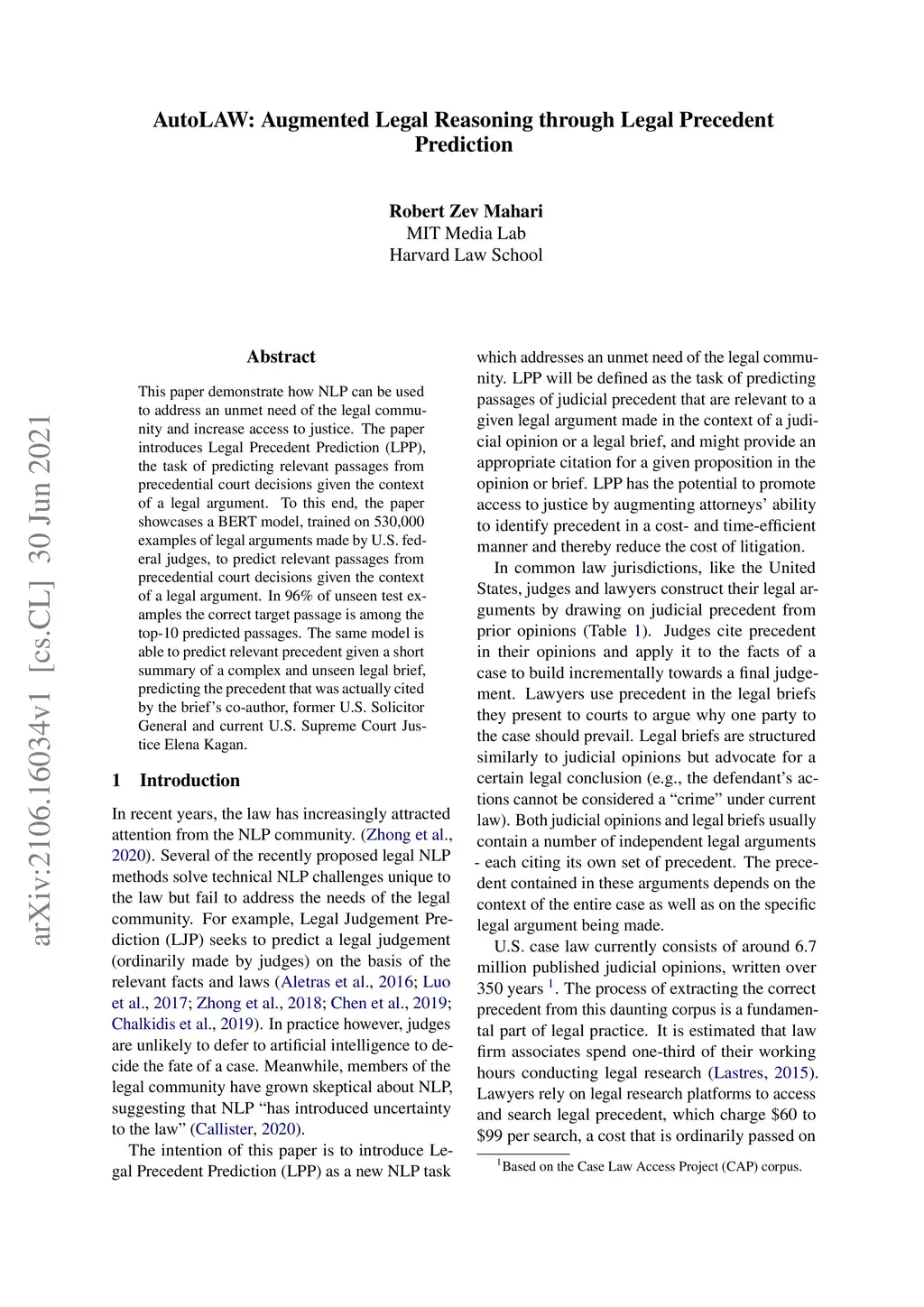 This paper demonstrate how NLP can be used to address an unmet need of the legal community and increase access to justice. The paper introduces Legal Precedent Prediction (LPP), the task of predicting relevant passages from precedential court decisions given the context of a legal argument. To this end, the paper showcases a BERT model, trained on 530,000 examples of legal arguments made by U.S. federal judges, to predict relevant passages from precedential court decisions given the context of a legal argument. In 96% of unseen test examples the correct target passage is among the top-10 predicted passages. The same model is able to predict relevant precedent given a short summary of a complex and unseen legal brief, predicting the precedent that was actually cited by the brief's co-author, former U.S. Solicitor General and current U.S. Supreme Court Justice Elena Kagan.