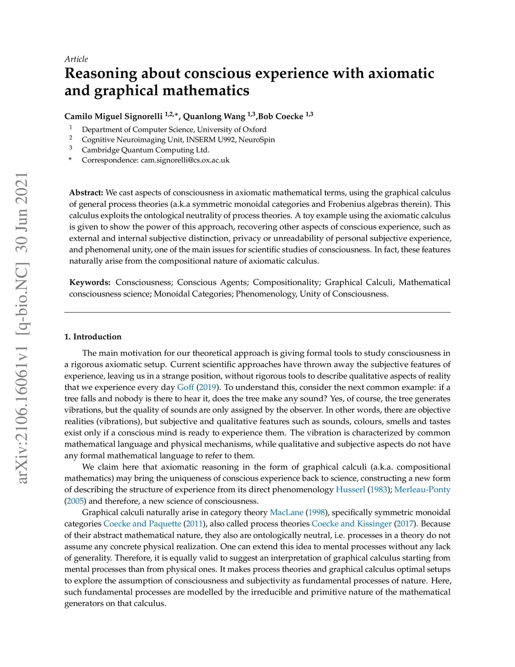 We cast aspects of consciousness in axiomatic mathematical terms, using the graphical calculus of general process theories (a.k.a symmetric monoidal categories and Frobenius algebras therein). This calculus exploits the ontological neutrality of process theories. A toy example using the axiomatic calculus is given to show the power of this approach, recovering other aspects of conscious experience, such as external and internal subjective distinction, privacy or unreadability of personal subjective experience, and phenomenal unity, one of the main issues for scientific studies of consciousness. In fact, these features naturally arise from the compositional nature of axiomatic calculus.