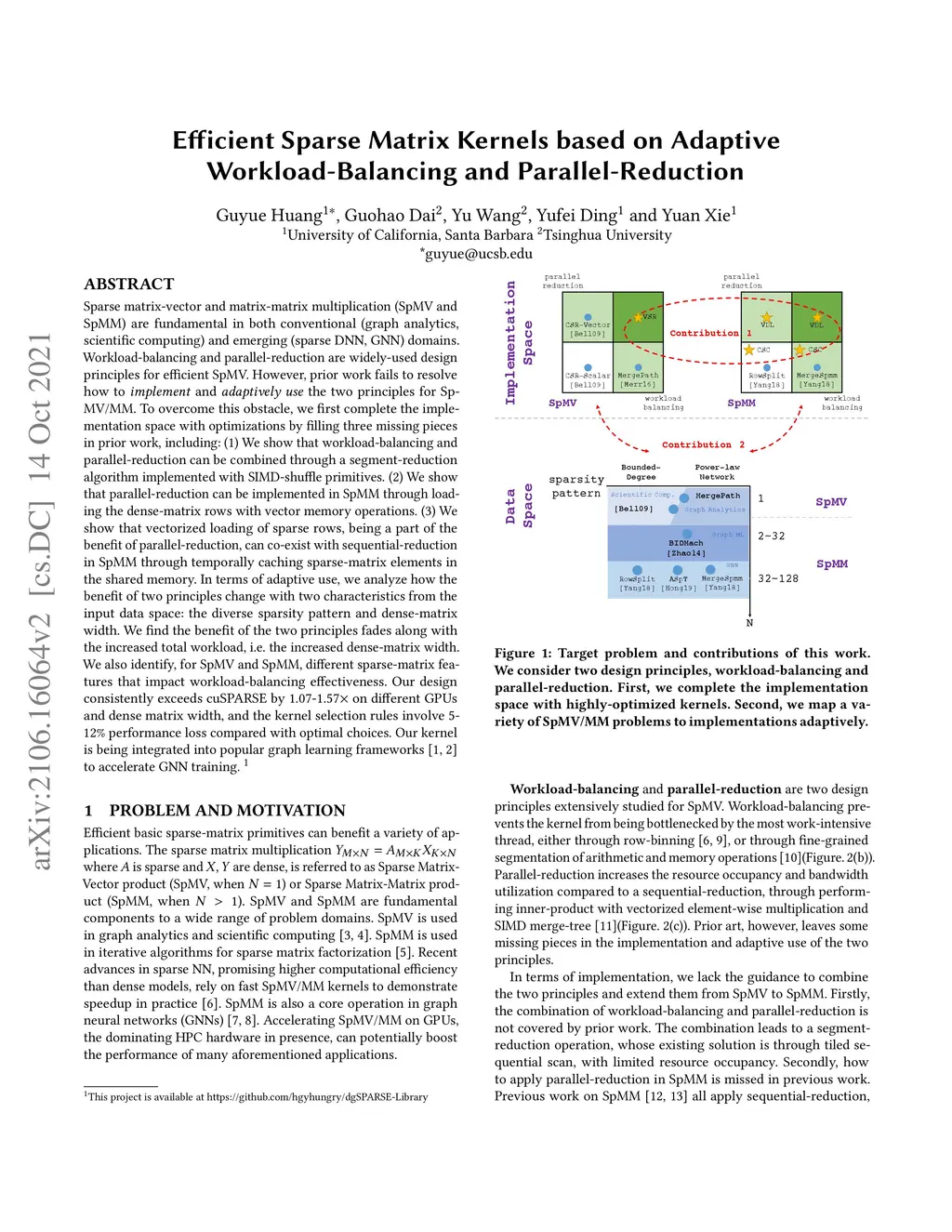 Sparse matrix-vector and matrix-matrix multiplication (SpMV and SpMM) are fundamental in both conventional (graph analytics, scientific computing) and emerging (sparse DNN, GNN) domains. Workload-balancing and parallel-reduction are widely-used design principles for efficient SpMV. However, prior work fails to resolve how to implement and adaptively use the two principles for SpMV/MM. To overcome this obstacle, we first complete the implementation space with optimizations by filling three missing pieces in prior work, including: (1) We show that workload-balancing and parallel-reduction can be combined through a segment-reduction algorithm implemented with SIMD-shuffle primitives. (2) We show that parallel-reduction can be implemented in SpMM through loading the dense-matrix rows with vector memory operations. (3) We show that vectorized loading of sparse rows, being a part of the benefit of parallel-reduction, can co-exist with sequential-reduction in SpMM through temporally caching sparse-matrix elements in the shared memory. In terms of adaptive use, we analyze how the benefit of two principles change with two characteristics from the input data space: the diverse sparsity pattern and dense-matrix width. We find the benefit of the two principles fades along with the increased total workload, i.e. the increased dense-matrix width. We also identify, for SpMV and SpMM, different sparse-matrix features that impact workload-balancing effectiveness. Our design consistently exceeds cuSPARSE by 1.07-1.57x on different GPUs and dense matrix width, and the kernel selection rules involve 5-12% performance loss compared with optimal choices. Our kernel is being integrated into popular graph learning frameworks to accelerate GNN training.