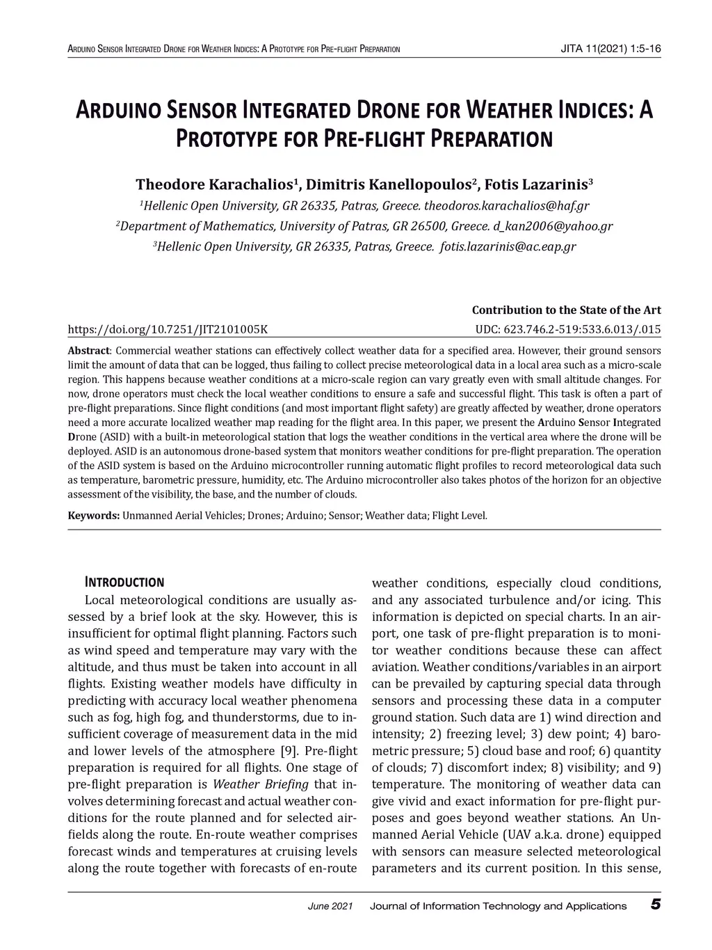 Commercial weather stations can effectively collect weather data for a specified area. However, their ground sensors limit the amount of data that can be logged, thus failing to collect precise meteorological data in a local area such as a micro-scale region. This happens because weather conditions at a micro-scale region can vary greatly even with small altitude changes. For now, drone operators must check the local weather conditions to ensure a safe and successful flight. This task is often a part of pre-flight preparations. Since flight conditions (and most important flight safety) are greatly affected by weather, drone operators need a more accurate localized weather map reading for the flight area. In this paper, we present the Arduino Sensor Integrated Drone (ASID) with a built-in meteorological station that logs the weather conditions in the vertical area where the drone will be deployed. ASID is an autonomous drone-based system that monitors weather conditions for pre-flight preparation. The operation of the ASID system is based on the Arduino microcontroller running automatic flight profiles to record meteorological data such as temperature, barometric pressure, humidity, etc. The Arduino microcontroller also takes photos of the horizon for an objective assessment of the visibility, the base, and the number of clouds.