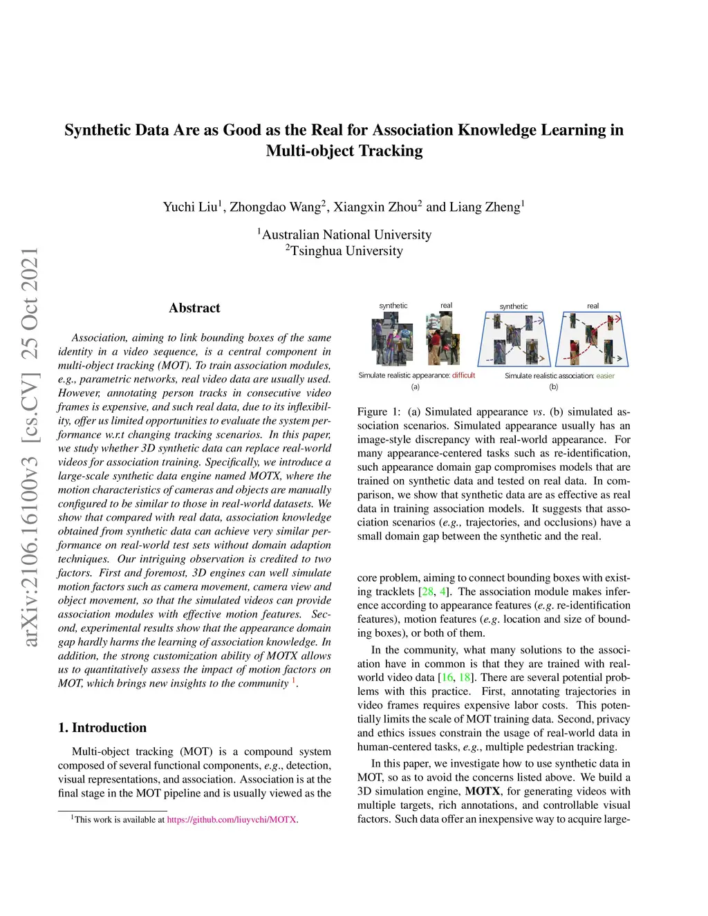 Association, aiming to link bounding boxes of the same identity in a video sequence, is a central component in multi-object tracking (MOT). To train association modules, e.g., parametric networks, real video data are usually used. However, annotating person tracks in consecutive video frames is expensive, and such real data, due to its inflexibility, offer us limited opportunities to evaluate the system performance w.r.t changing tracking scenarios. In this paper, we study whether 3D synthetic data can replace real-world videos for association training. Specifically, we introduce a large-scale synthetic data engine named MOTX, where the motion characteristics of cameras and objects are manually configured to be similar to those in real-world datasets. We show that compared with real data, association knowledge obtained from synthetic data can achieve very similar performance on real-world test sets without domain adaption techniques. Our intriguing observation is credited to two factors. First and foremost, 3D engines can well simulate motion factors such as camera movement, camera view and object movement, so that the simulated videos can provide association modules with effective motion features. Second, experimental results show that the appearance domain gap hardly harms the learning of association knowledge. In addition, the strong customization ability of MOTX allows us to quantitatively assess the impact of motion factors on MOT, which brings new insights to the community.