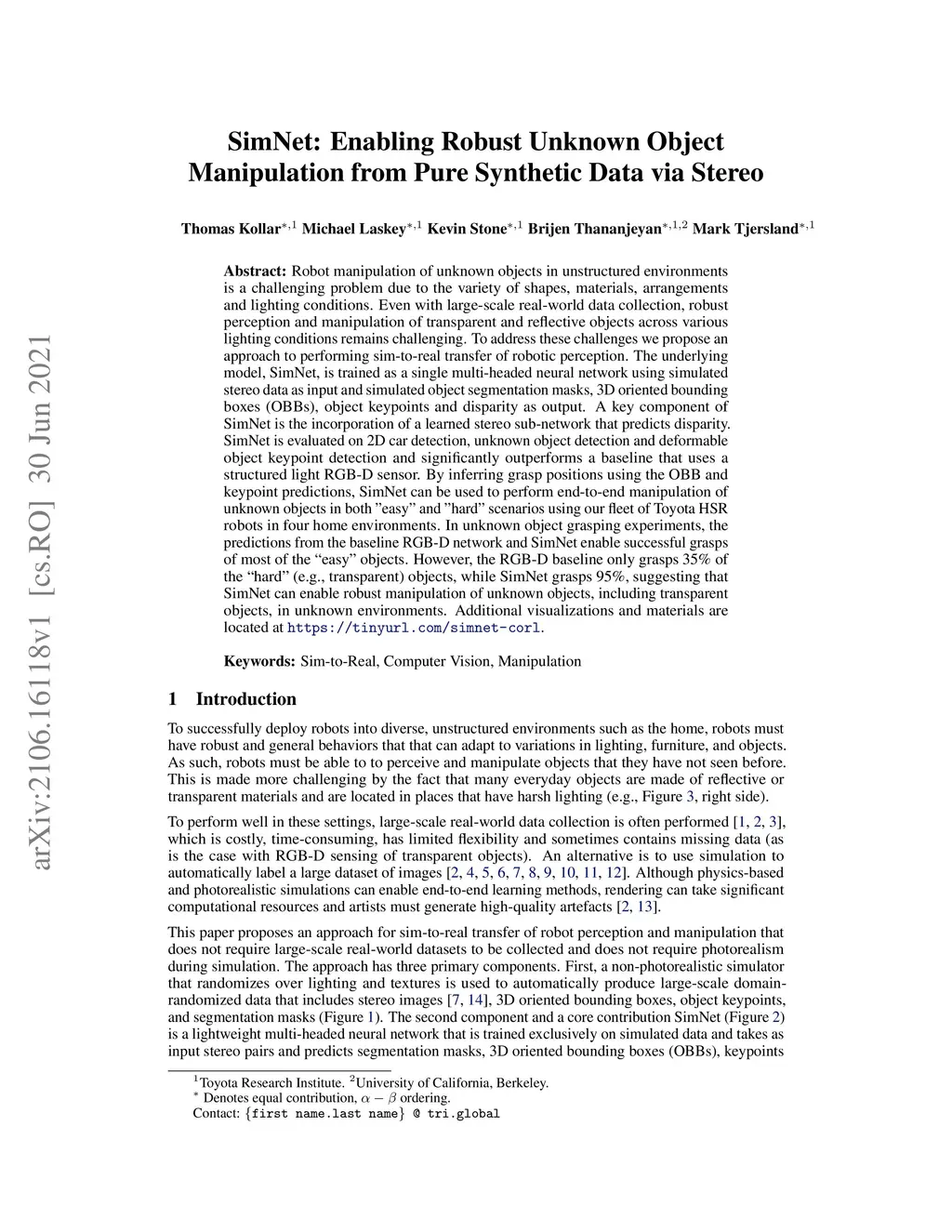 Robot manipulation of unknown objects in unstructured environments is a challenging problem due to the variety of shapes, materials, arrangements and lighting conditions. Even with large-scale real-world data collection, robust perception and manipulation of transparent and reflective objects across various lighting conditions remain challenging. To address these challenges we propose an approach to performing sim-to-real transfer of robotic perception. The underlying model, SimNet, is trained as a single multi-headed neural network using simulated stereo data as input and simulated object segmentation masks, 3D oriented bounding boxes (OBBs), object keypoints, and disparity as output. A key component of SimNet is the incorporation of a learned stereo sub-network that predicts disparity. SimNet is evaluated on 2D car detection, unknown object detection, and deformable object keypoint detection and significantly outperforms a baseline that uses a structured light RGB-D sensor. By inferring grasp positions using the OBB and keypoint predictions, SimNet can be used to perform end-to-end manipulation of unknown objects in both easy and hard scenarios using our fleet of Toyota HSR robots in four home environments. In unknown object grasping experiments, the predictions from the baseline RGB-D network and SimNet enable successful grasps of most of the easy objects. However, the RGB-D baseline only grasps 35% of the hard (e.g., transparent) objects, while SimNet grasps 95%, suggesting that SimNet can enable robust manipulation of unknown objects, including transparent objects, in unknown environments.